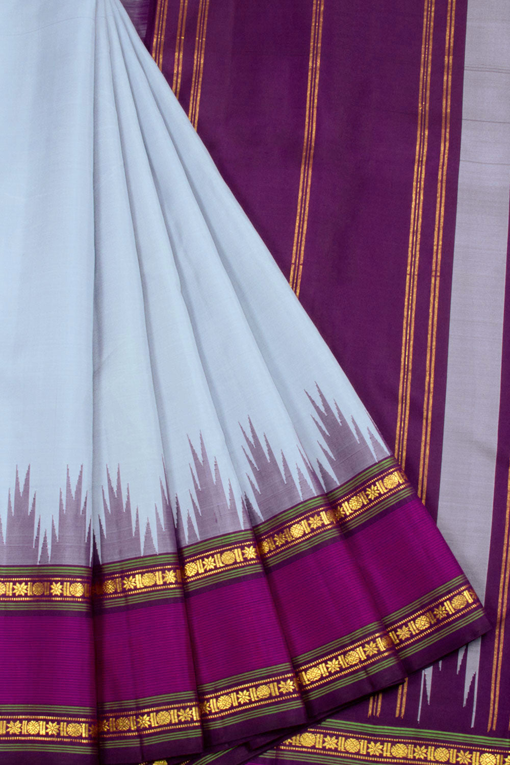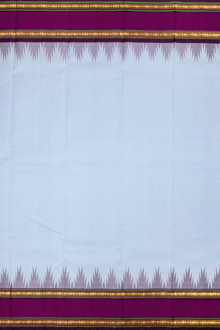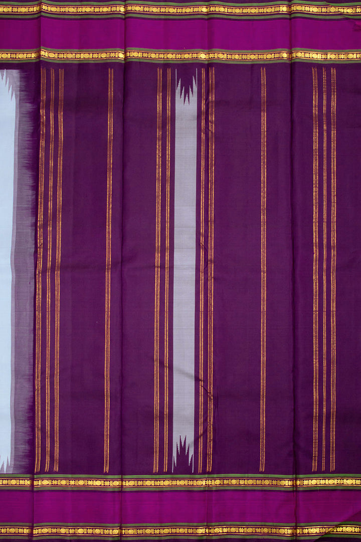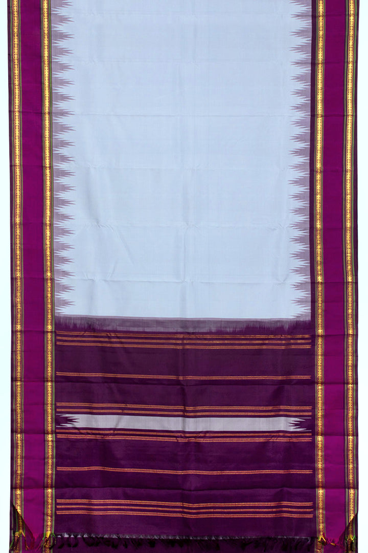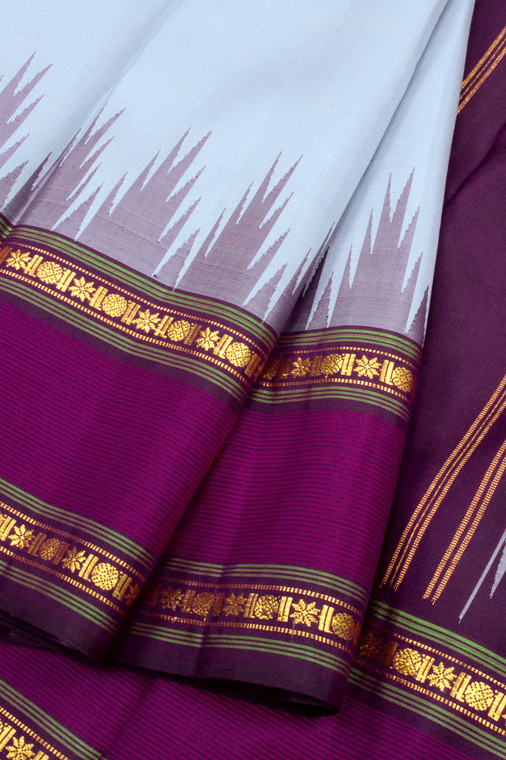 This exquisite Grey Handloom Korvai Kanjivaram Silk Saree is a gorgeous statement piece with its temple border and gold zari geometric bands and stripes on the pallu. The fabric is lightweight and comfortable, perfect for any special occasion.