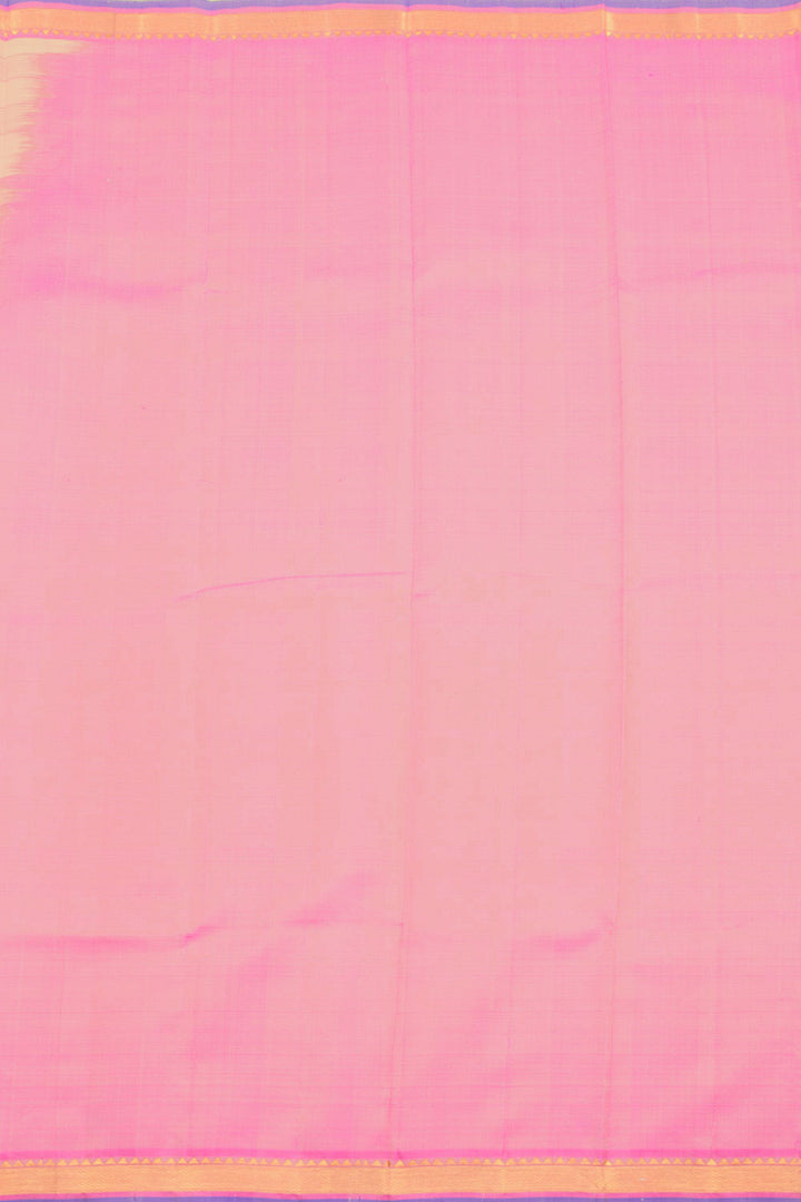 This elegant Pastel Cream Handloom Pure Zari Kanjivaram Silk Saree features a striped design in a soft rose color. The border in contrasting Dusky Rose includes a strip of zari, while the Dusky Rose Pallu features striped zari patterns. Complementing the look is a Dusky Rose blouse.