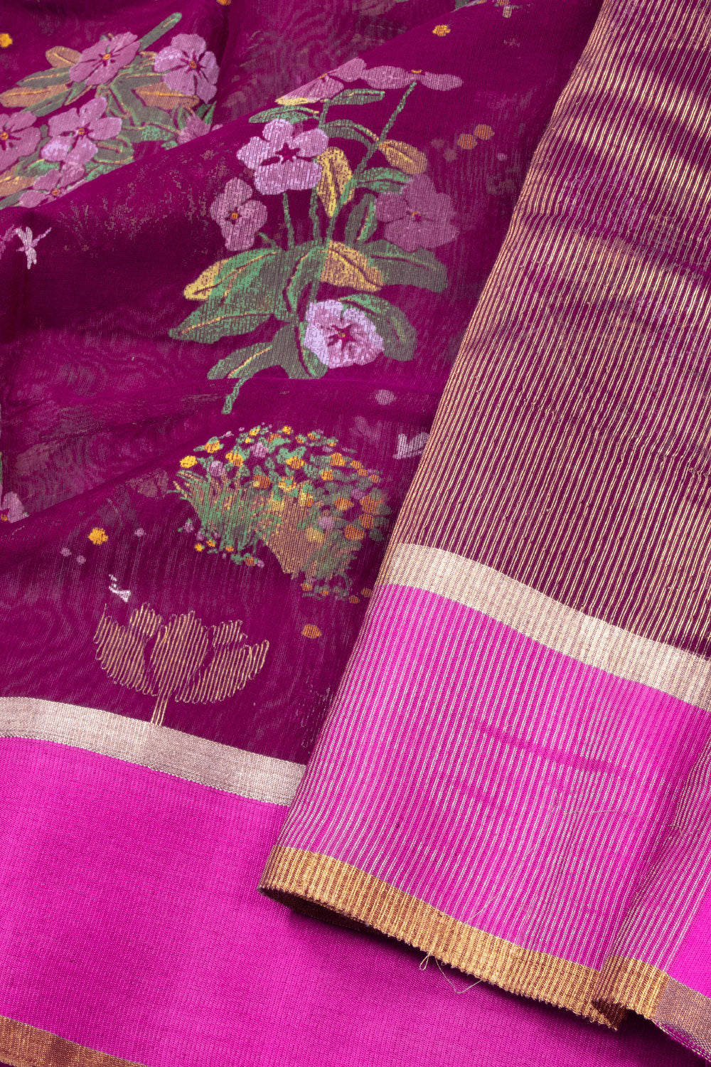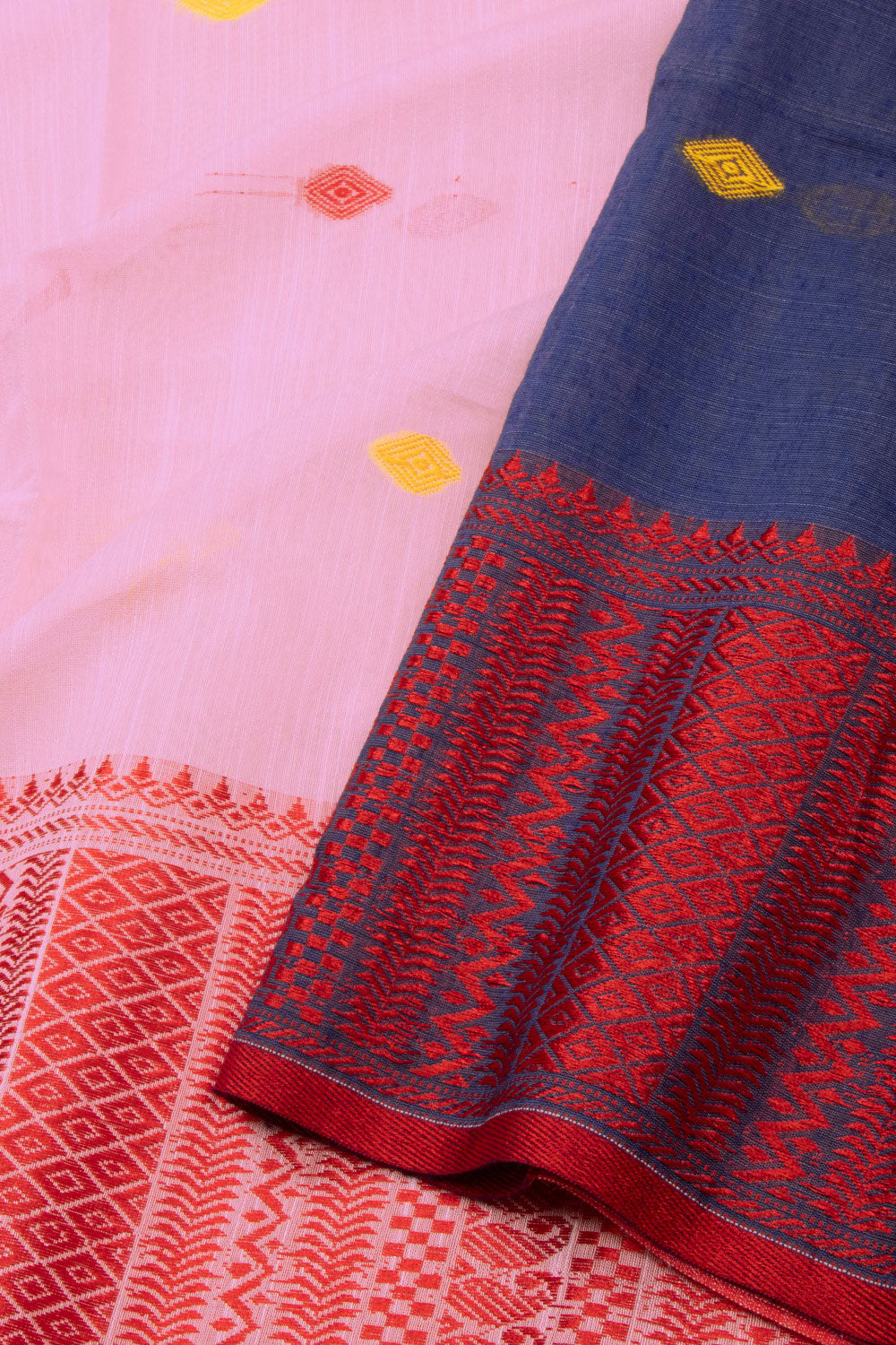 Fall in love with this charming pink Handloom Gadwal Kuttu Cotton saree, where intricate paisley motifs tell stories of traditional artistry and timeless beauty. Each handwoven detail celebrates the skill of master craftspeople...