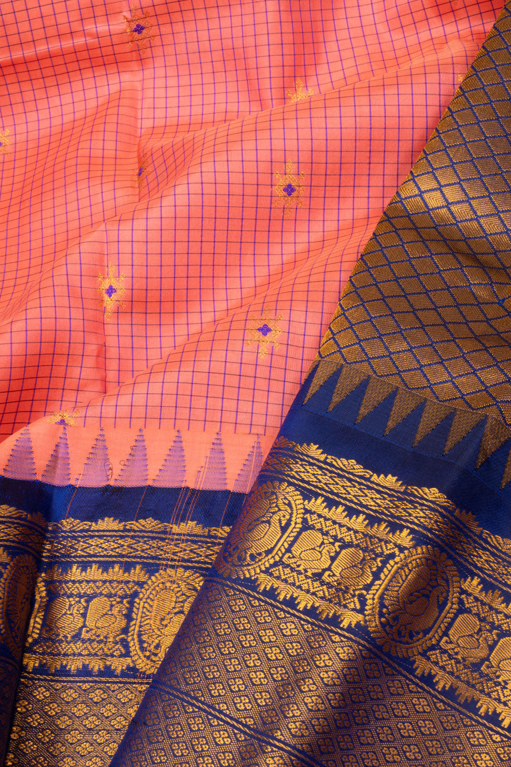 Celebrate your vibrant spirit in this delightful pink Art Silk Kanjivaram saree, where a charming checks pattern adds whimsy and character to timeless elegance. The geometric checked design brings playful sophistication, creati...