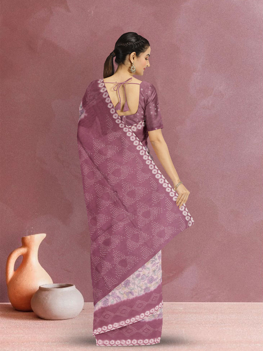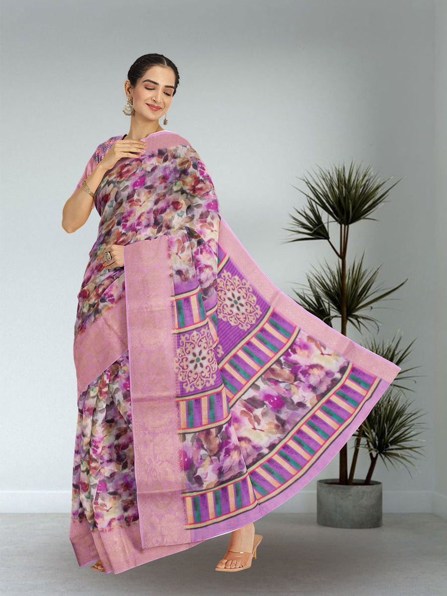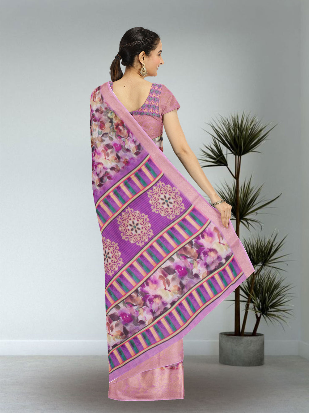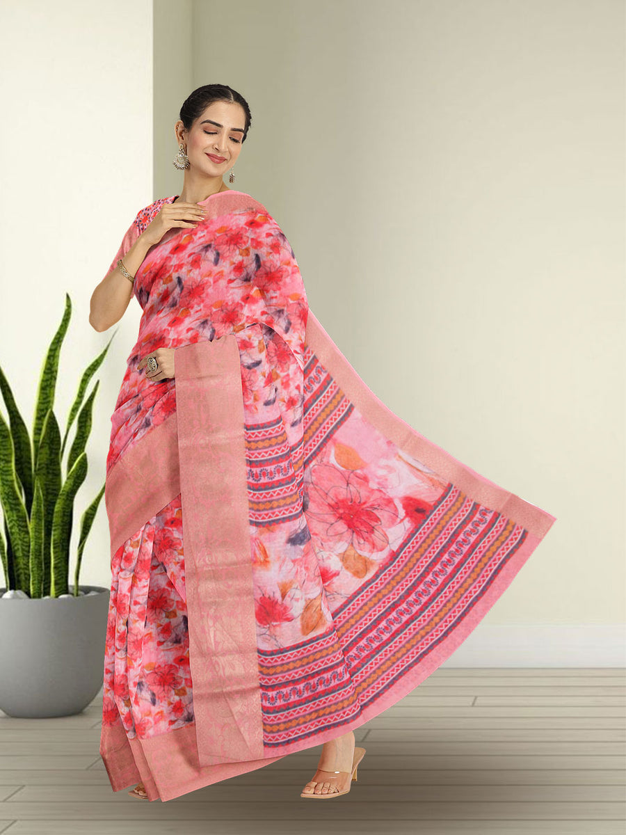 Get ready to elevate your style and grace with our Pink Fancy Printed Linen Saree. The beautiful floral design on both the saree and blouse will make a lasting impression at any occasion, from extravagant weddings to casual get...