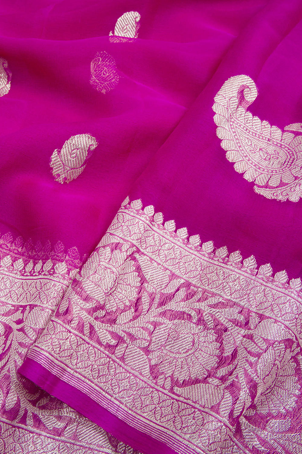 Hot Pink Handloom Banarasi Chiffon Saree Crafted with Paisley Motif and Jangla Border It's perfect for any special occasion, featuring intricate details that will make you stand out.