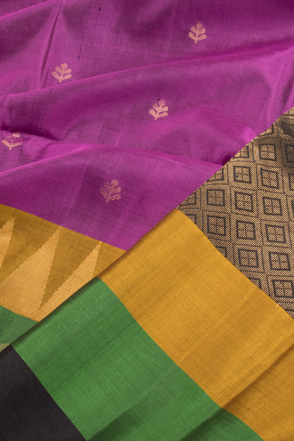 This exquisite Fuschia Pink Tissue Silk Pure Zari Kanjivaram Silk Saree features intricate temple motifs throughout the body, embellished with Rudhraksham motifs. The saree also has a brocade pallu, and is perfectly complemente...
