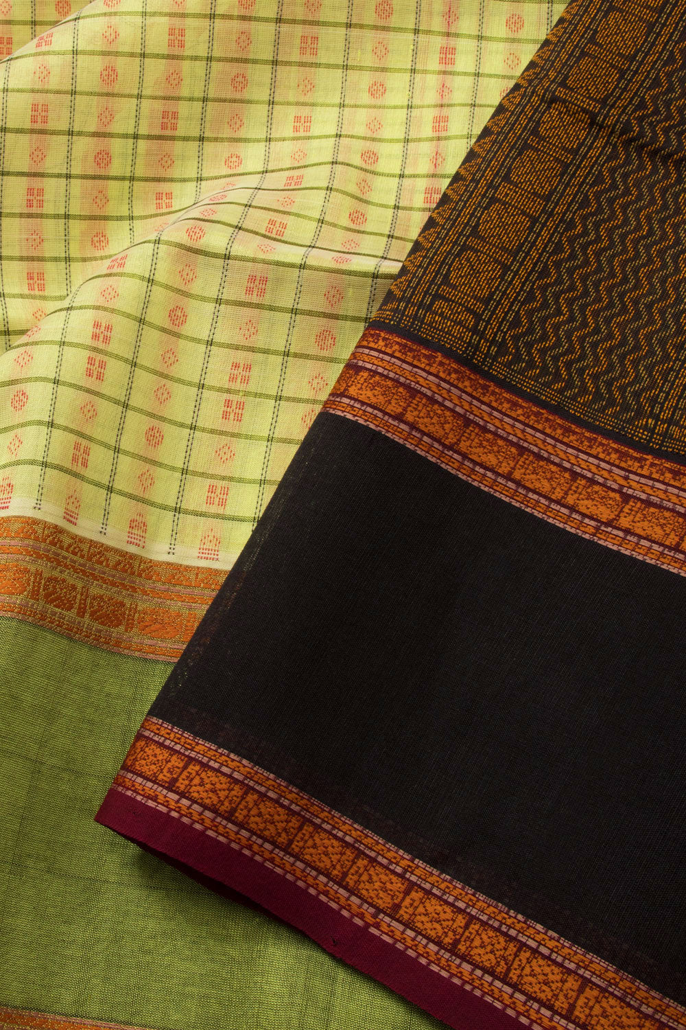 Experience the timeless elegance of Green Kanchi Cotton Sarees with a rich silk border. Crafted for comfort and style, these sarees blend breathable cotton with the luxurious sheen of silk, making them perfect for both casual w...