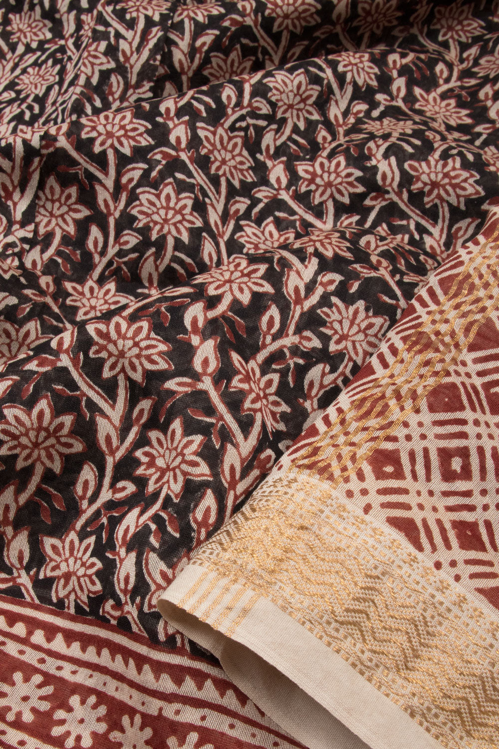 This Black Bagh Printed Silk Cotton Saree is crafted from a blend of cotton and shimmering silk that gives it a unique texture and finish. Subtly printed with delicate floral designs, this saree is perfect for day events and sp...