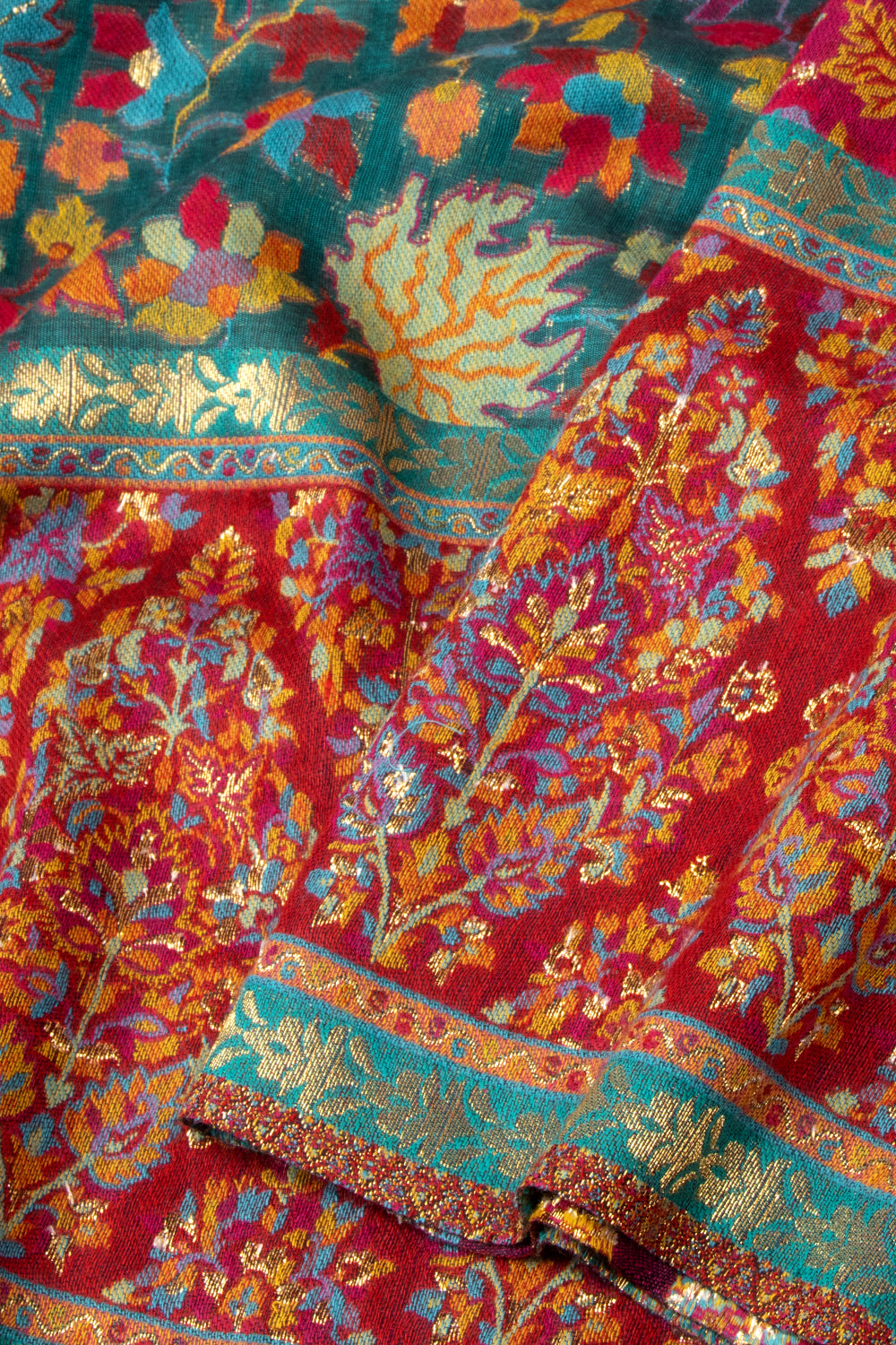 Cherry Red Handloom Banarasi Kora Silk Saree with Floral Motifs All Over the Body, Jangla Border and Floral Pallu This saree is sure to add an elegant touch to any wardrobe or special occasion, with its vibrant colors, intricat...