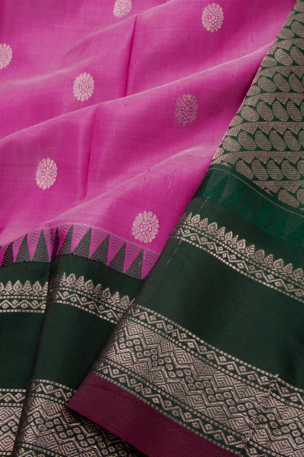 Dark Hot Pink Handcrafted Banarasi Khaddi Georgette Saree with an intricate jaal design adorning the body along with a jangla design on the border and a floral pallu. The vibrant combination of bright pink and sizzling silver z...