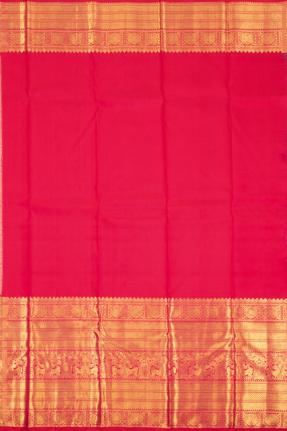 Korvai Weaving: The saree is meticulously crafted using the Korvai technique, where the body and border are woven separately and then interlocked, resulting in a striking contrast that highlights the saree’s regal charm.
