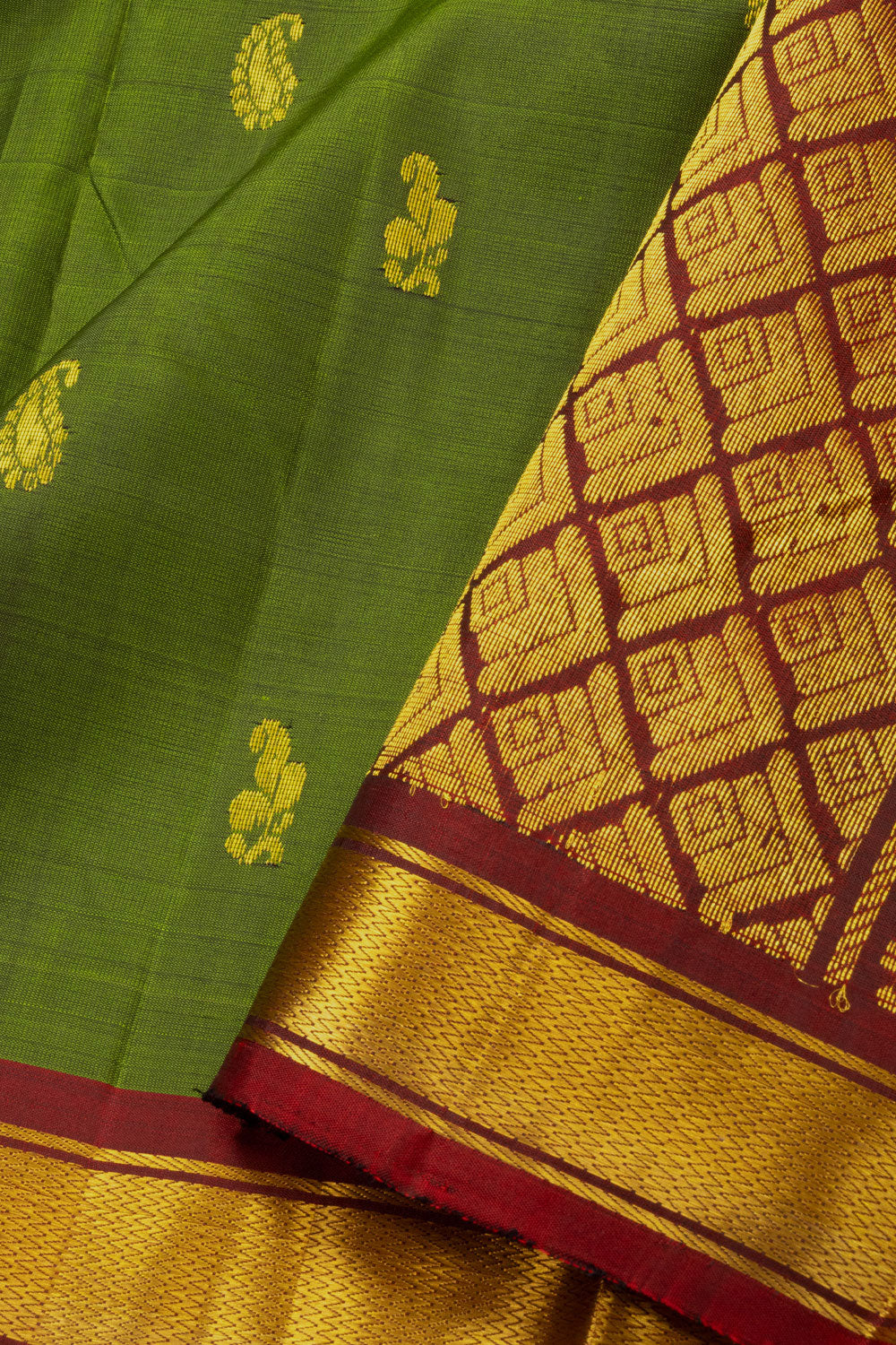 Get ready to turn heads with this stunning green handloom Kanjivaram soft silk saree that's bursting with charm! Created by dedicated weavers using traditional methods, this saree captures the essence of authentic Indian crafts...