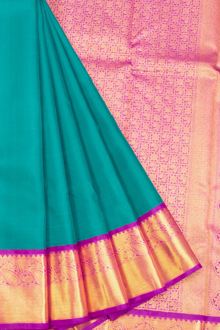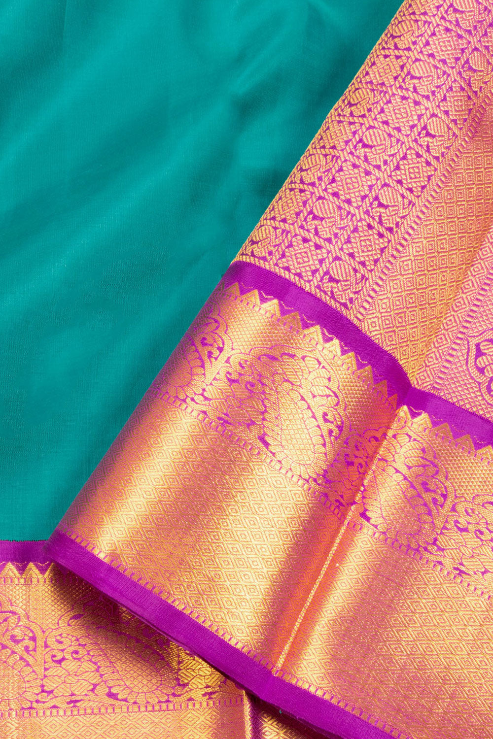 Discover the elegance of the Turquoise Green Nakashi Kanjivaram Silk Saree. Featuring intricate Nakashi embroidery on luxurious silk, this saree combines vibrant turquoise green with exquisite craftsmanship. Its rich texture an...