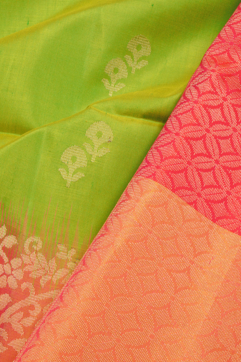 Embrace timeless grace with this enchanting Green Kanjivaram Vegan Silk Saree. Woven with sustainable plant-based silk, this beauty captures the essence of traditional craftsmanship while celebrating conscious fashion. The lush...