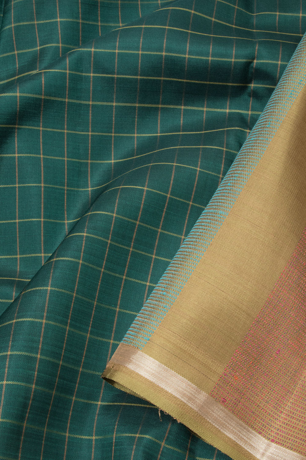 This beautiful Yellowish Green Kanjivaram Soft Silk Saree features peacock and teardrop floral motifs spread across its body. One side boasts a bold dark blue checked border accented with matching peacock and teardrop designs. ...
