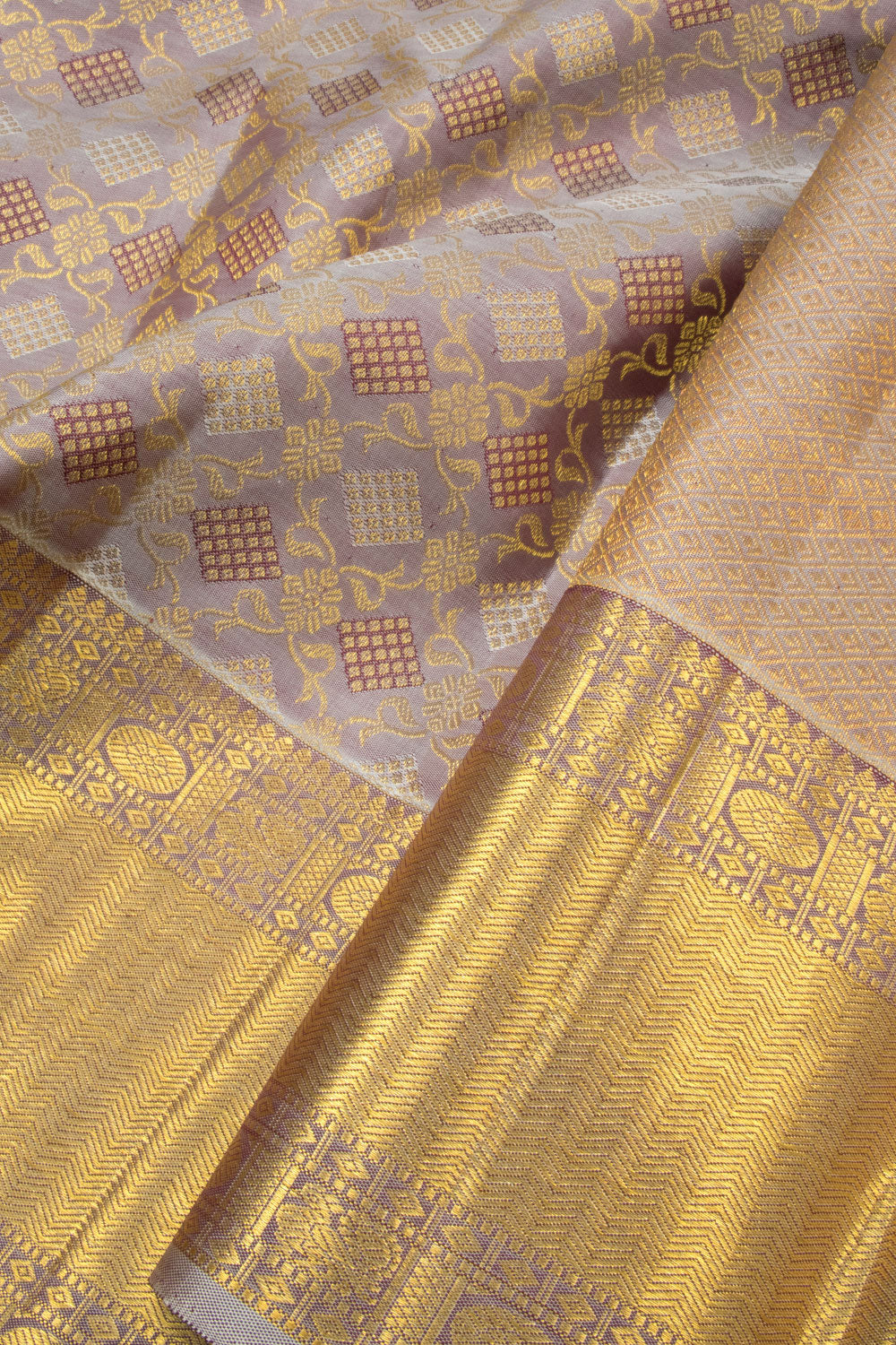 Grey Dual Tone Pure Zari Bridal Kanjivaram Silk Saree with All Over Floral Design on Body, Mayil Chakaram Border and Brocade Pallu This traditional drape boasts luxurious fabric for an elegant look and feel. The per...