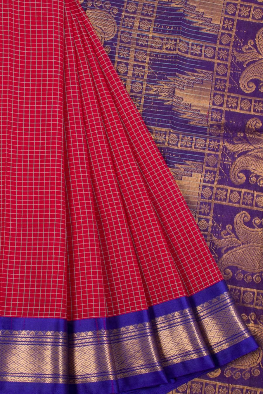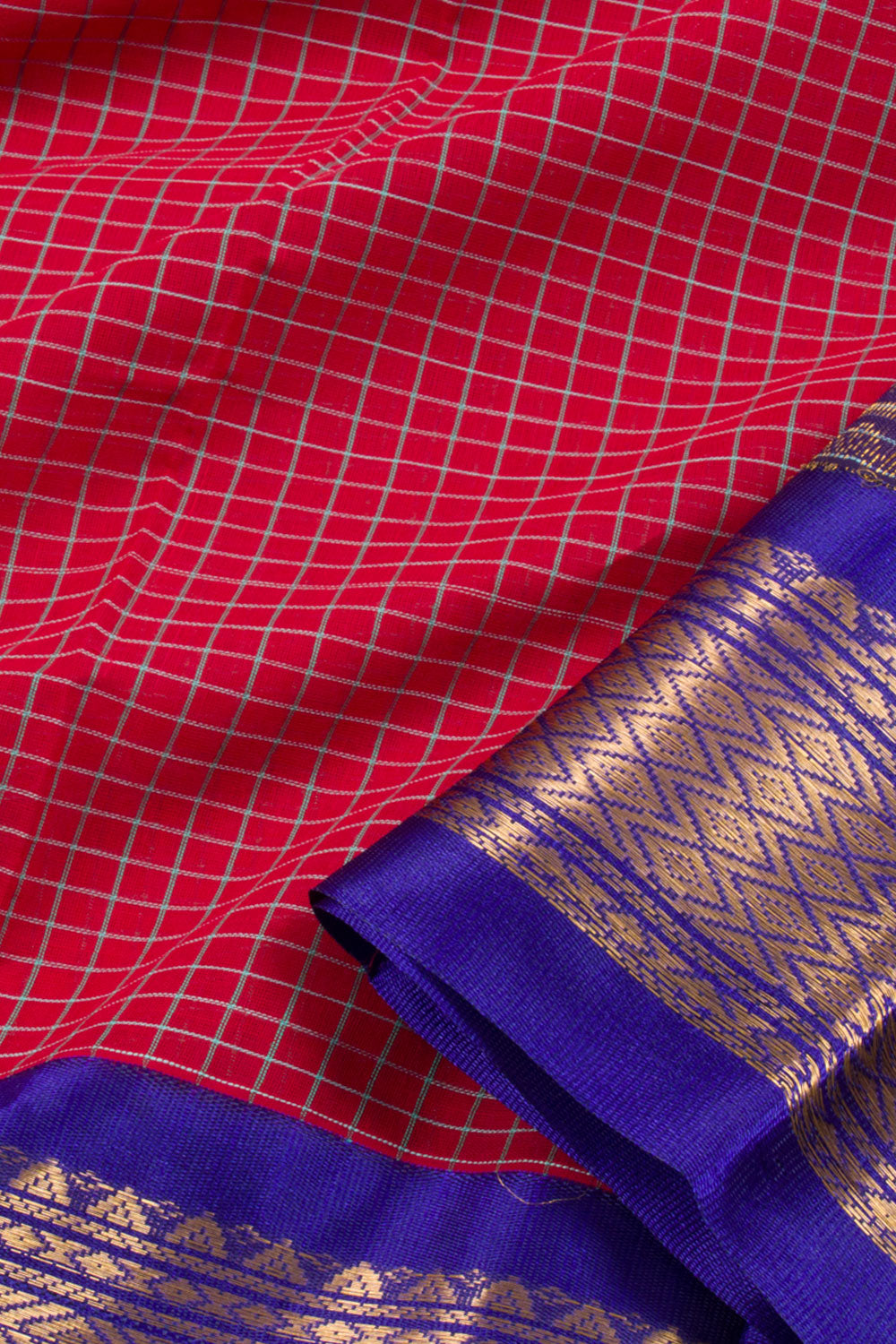 Crimson Red Gadwal Kuttu Cotton Saree with checks, Silk Border, Pallu and Without Blouse 10061424