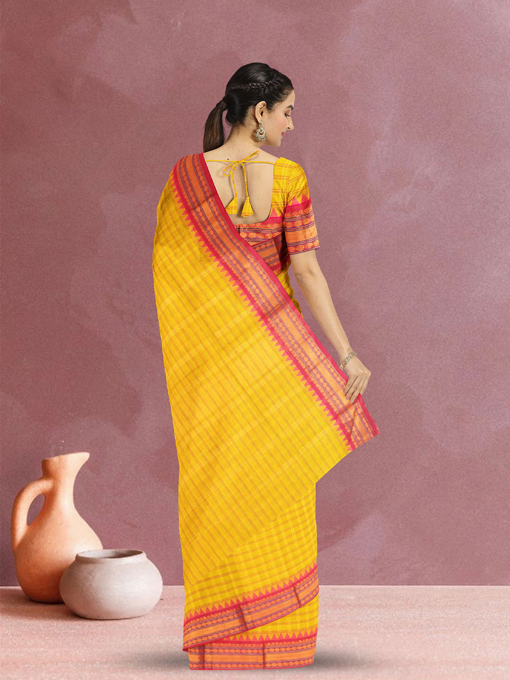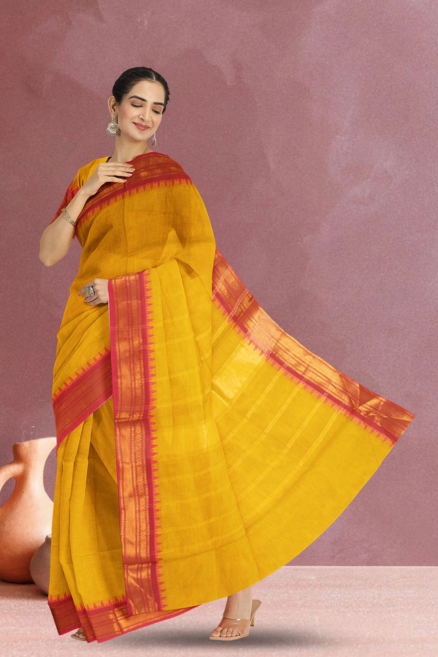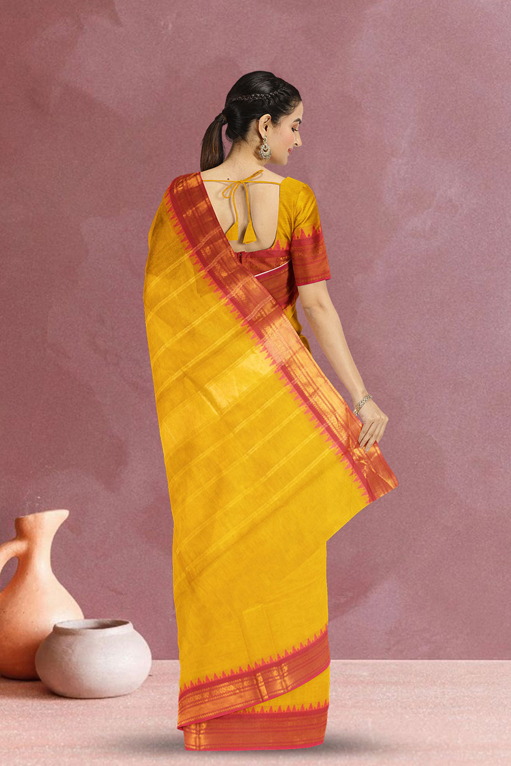 Unleash a burst of vibrant energy with our Yellow Handloom Kanchi Cotton Saree! Handwoven with premium quality cotton, this saree boasts a stunning yellow hue that will make you stand out from the crowd. Perfect for any occasio...