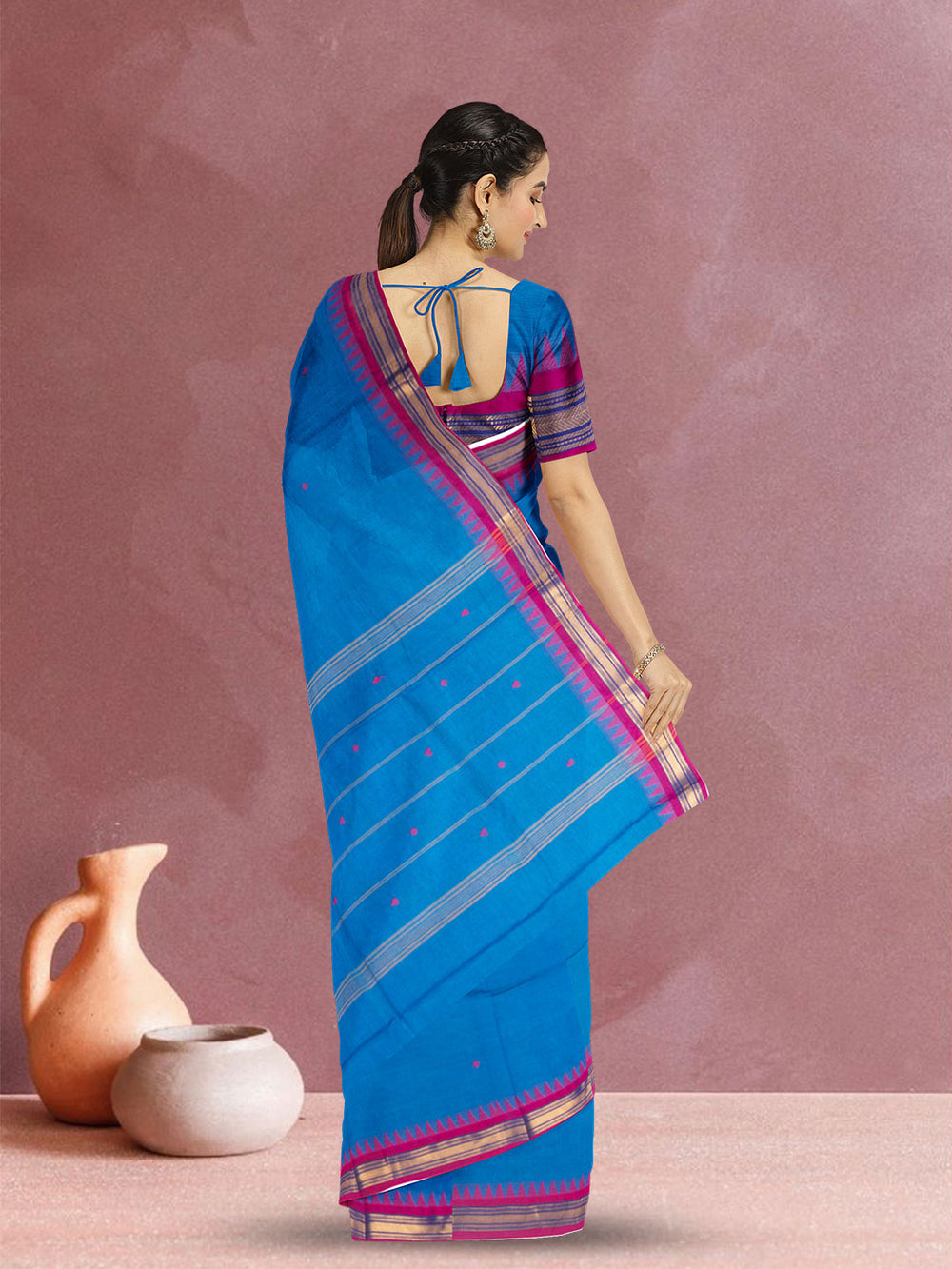 This Stunning Peach Korvai Kanchi Cotton Saree boasts a Vibrant Red Temple Border. The saree is adorned with a striped pallu and accompanies a matching blouse.