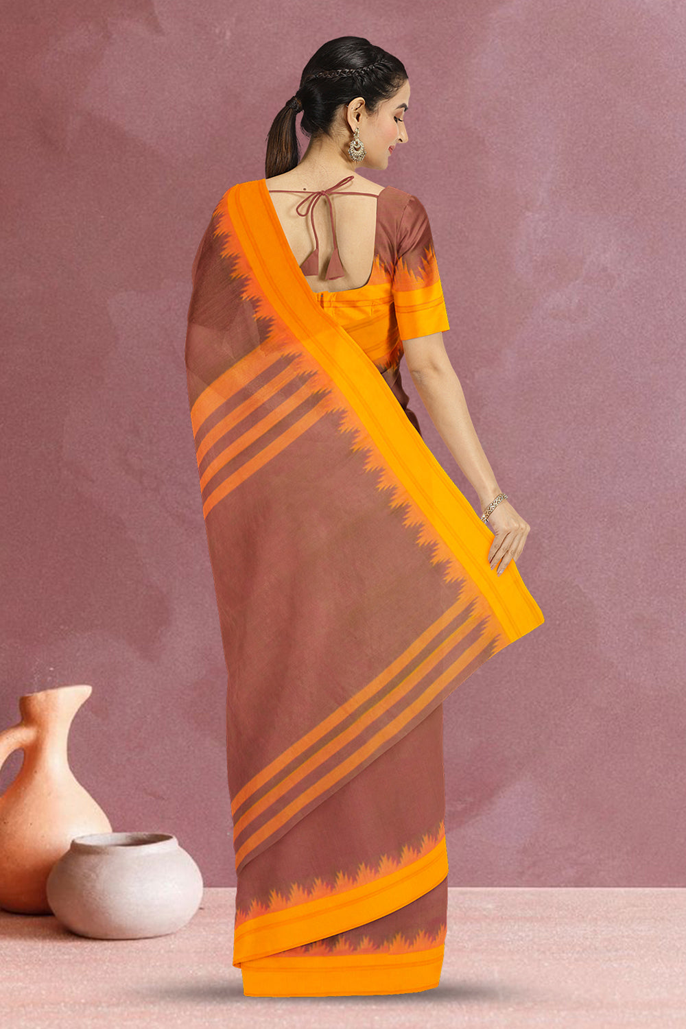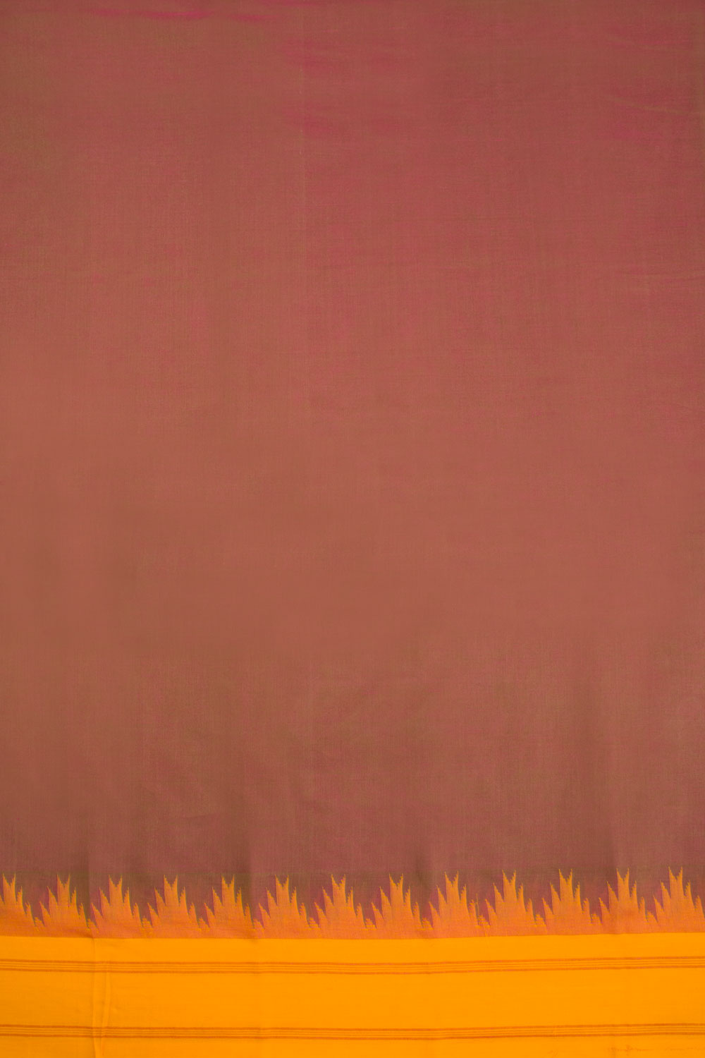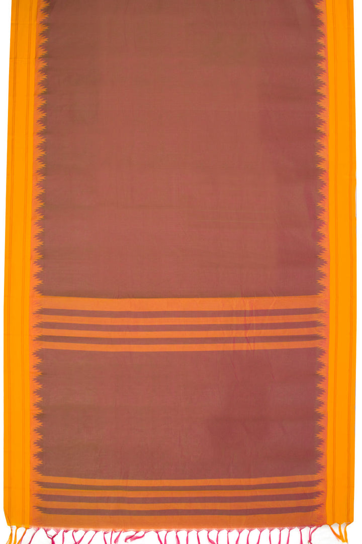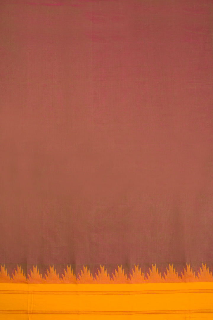 Experience the beauty of our Mauve and Pink Dual Tone Korvai Kanchi Cotton Saree, featuring a stunning contrast Yellow Temple Border. The Pallu is adorned with yellow stripes, making this saree a true masterpiece. Complete with a running blouse, this saree is the perfect addition to your collection.
