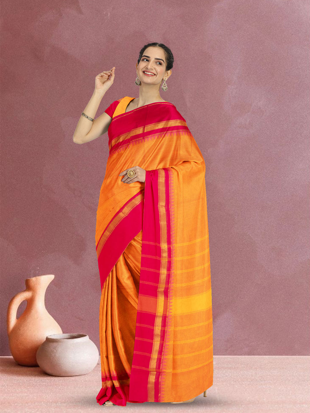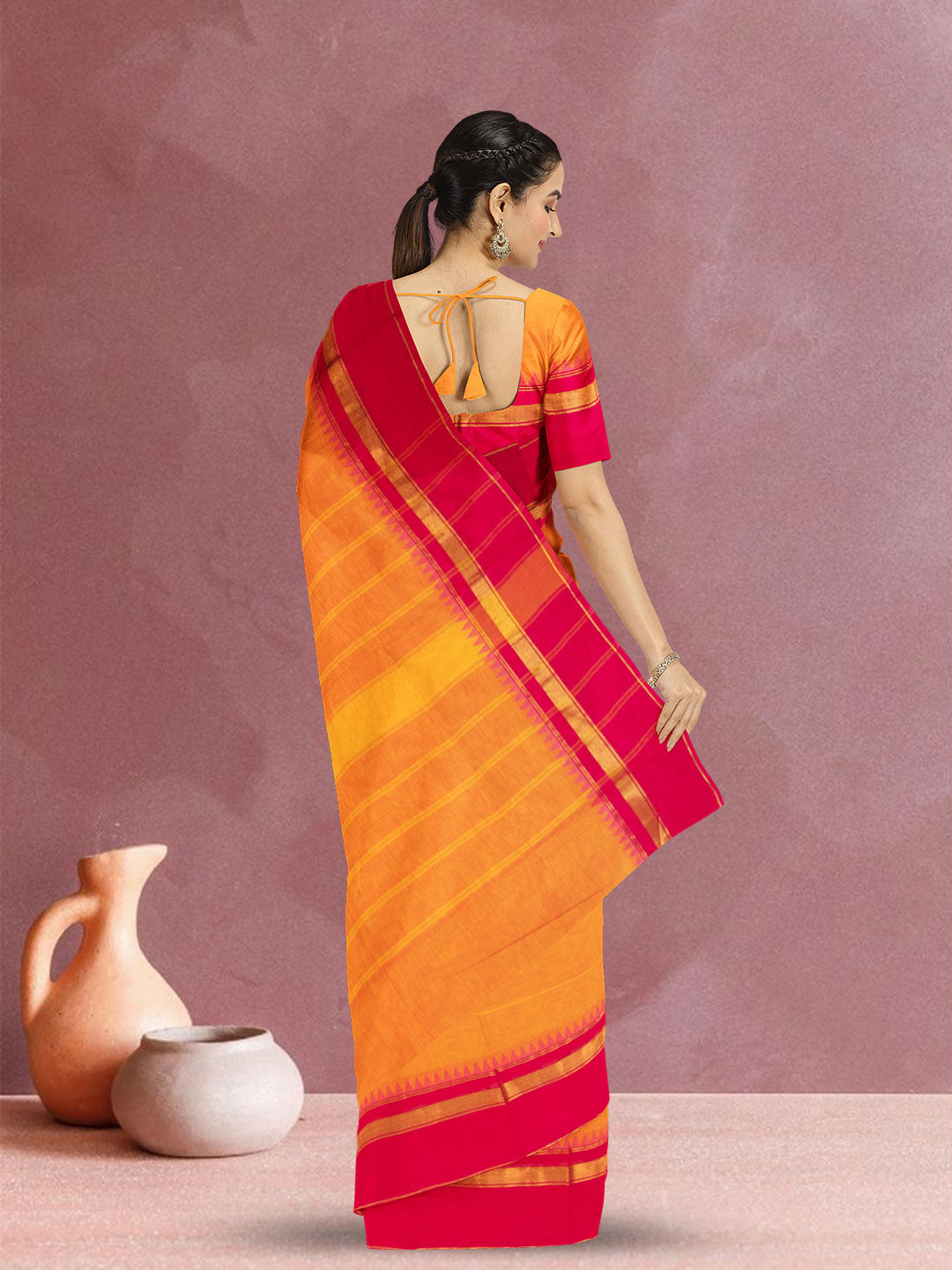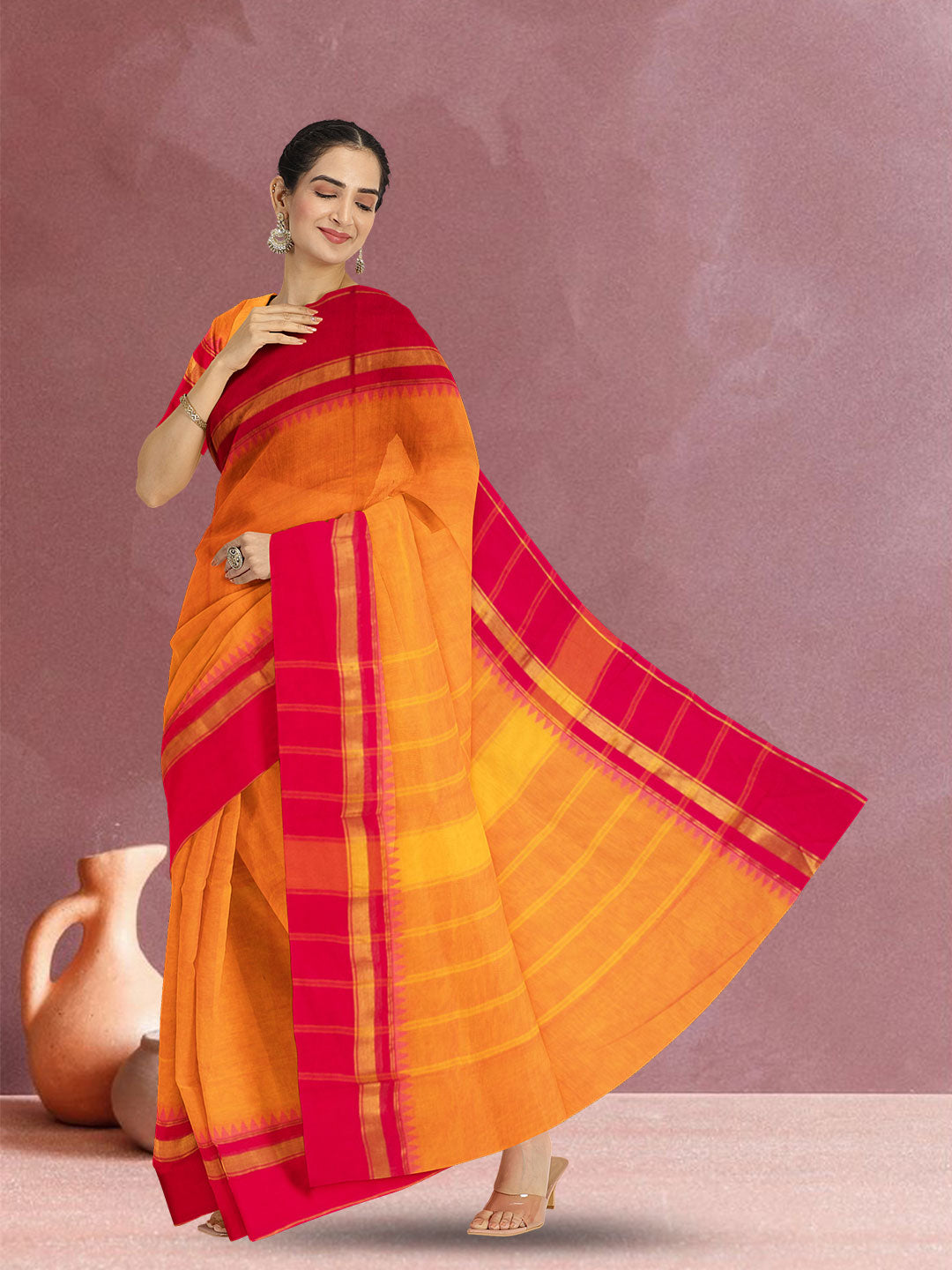 Experience elegance and tradition with our Orange Handloom Kanchi Cotton Saree. Made with high quality cotton, this saree is handloom woven for a unique and beautiful texture. Perfect for any occasion, its vibrant orange color and intricate design will make you stand out in style!