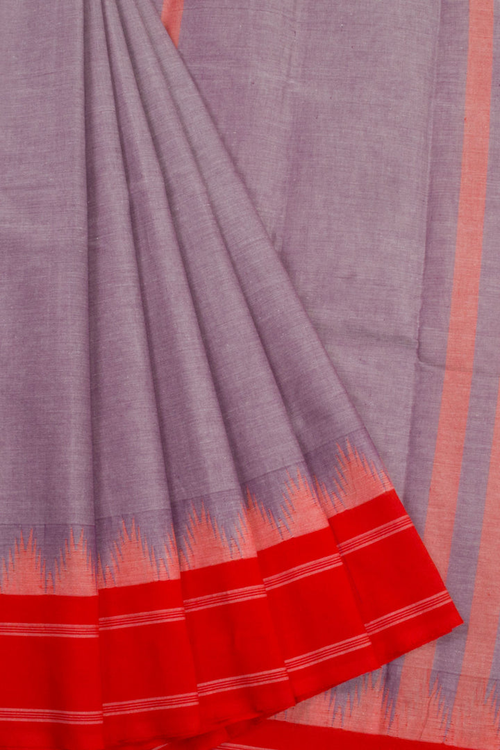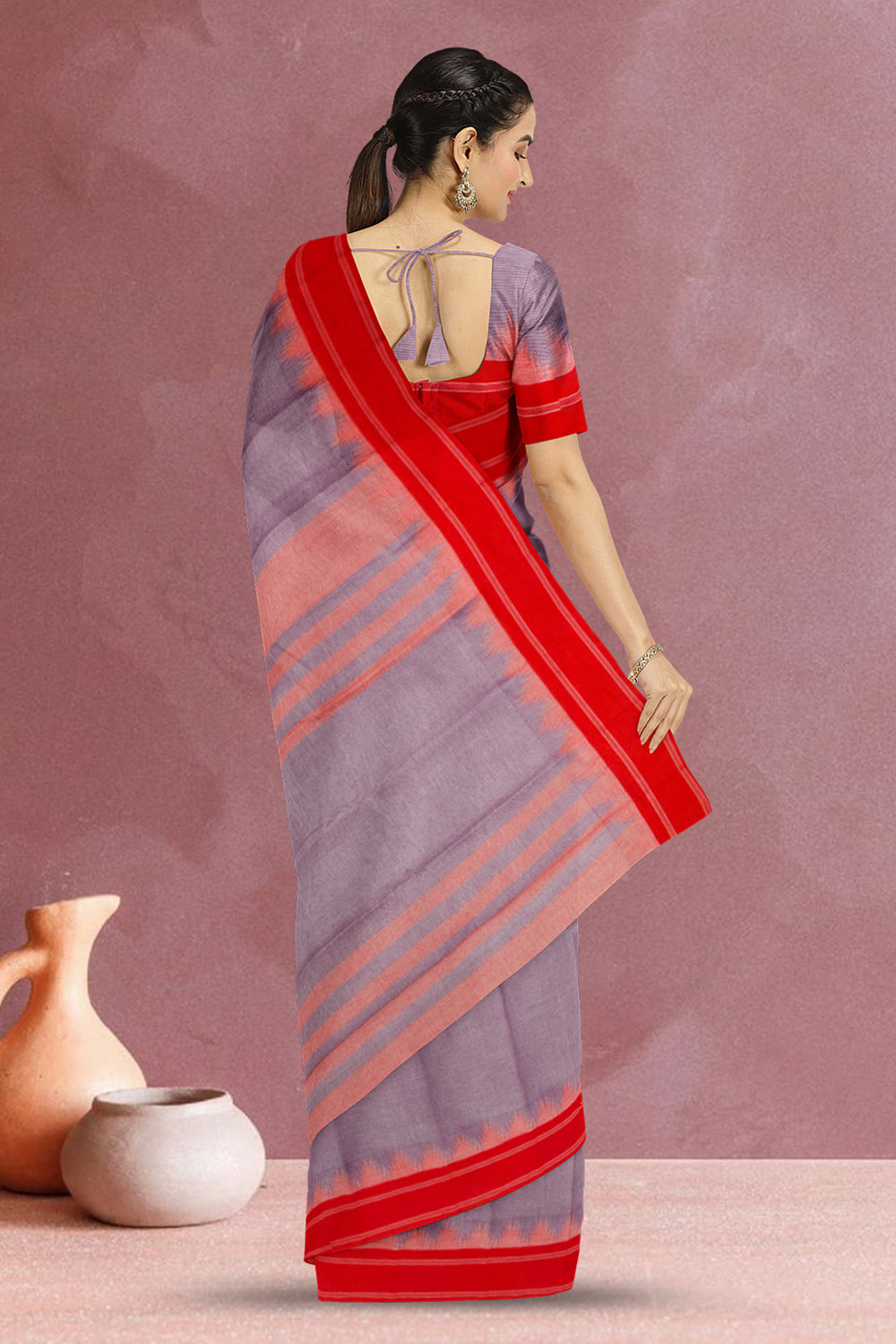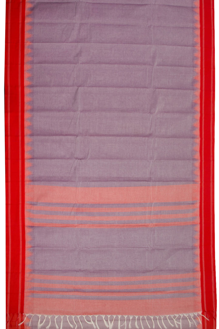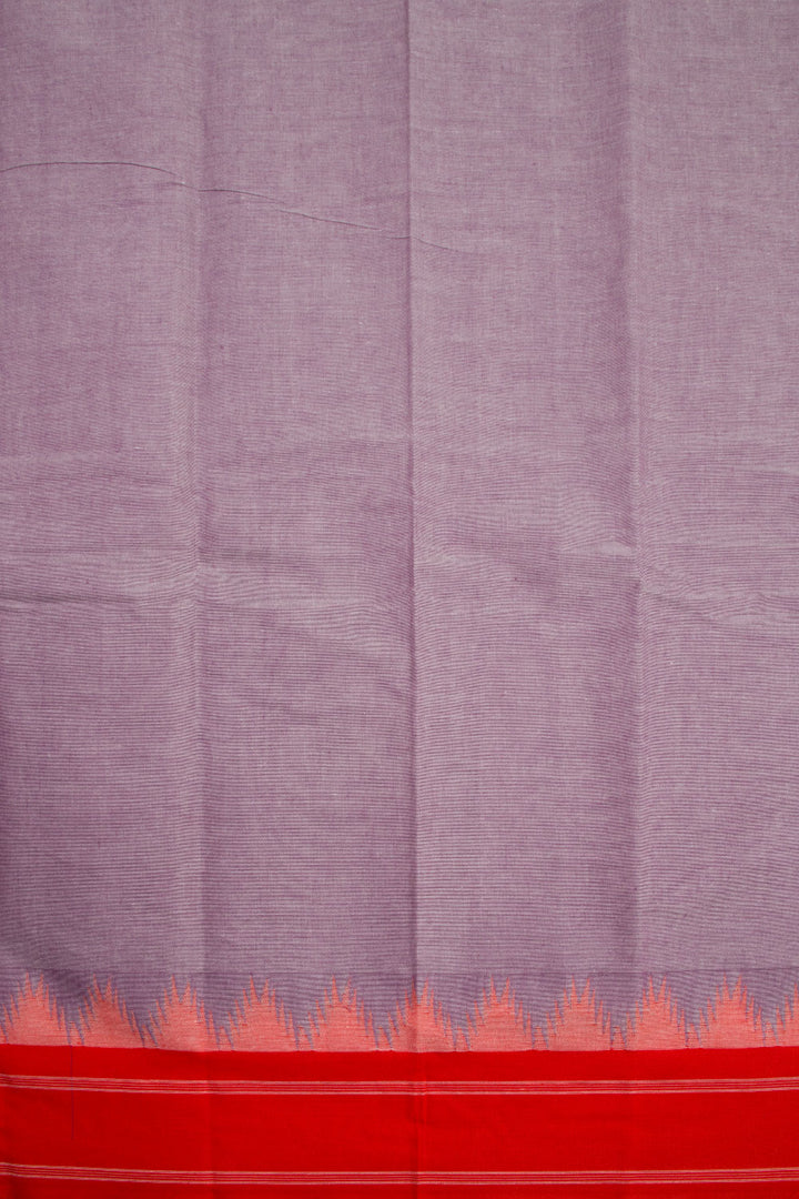 Experience the stunning Purple Korvai Kanchi Cotton Saree with a striking Tomato Red Temple Border. Adorned with a striped pallu and complete with a flowing blouse, this saree is a true masterpiece.