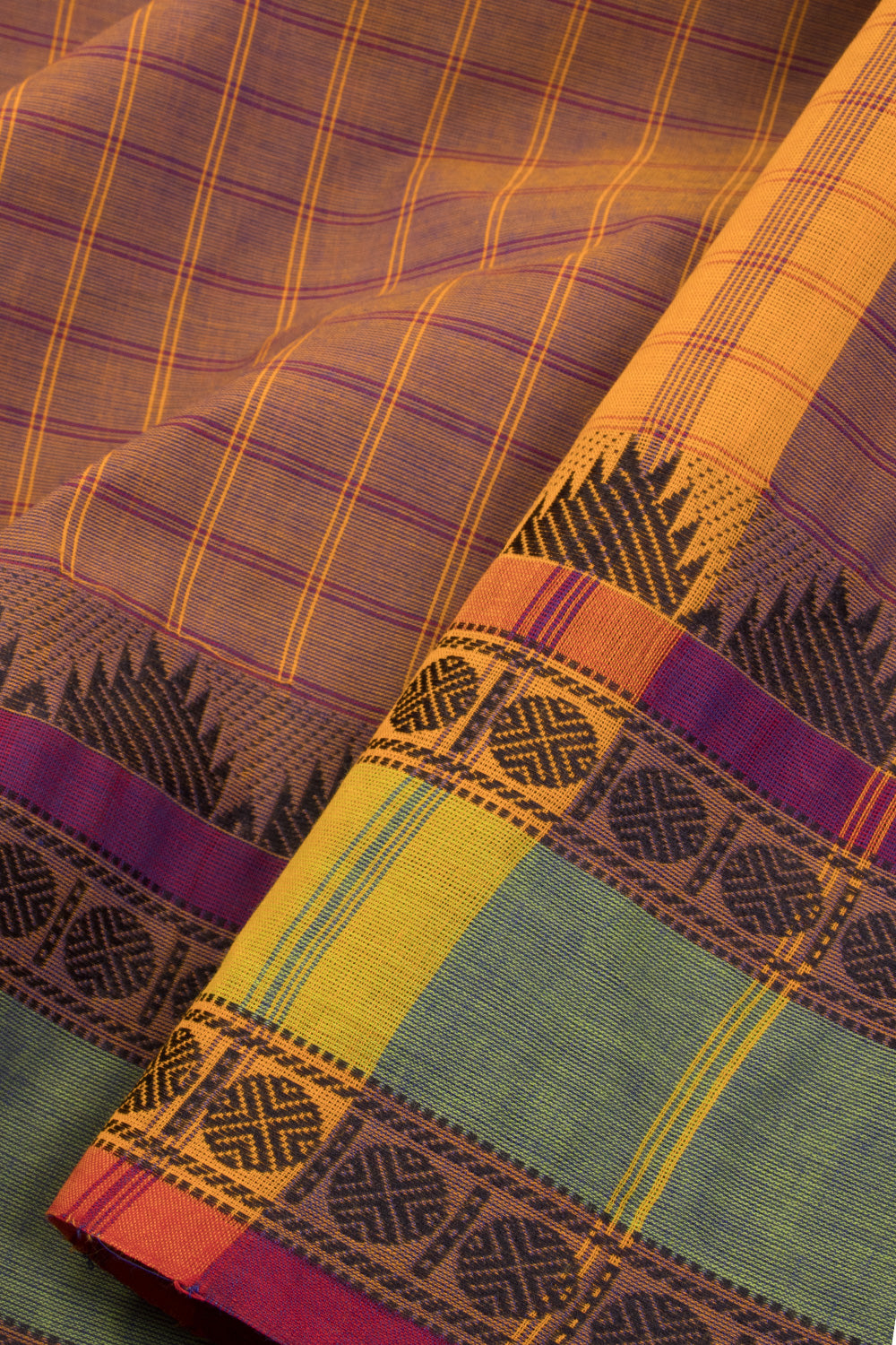 This Stunning Peach Korvai Kanchi Cotton Saree boasts a Vibrant Red Temple Border. The saree is adorned with a striped pallu and accompanies a matching blouse.