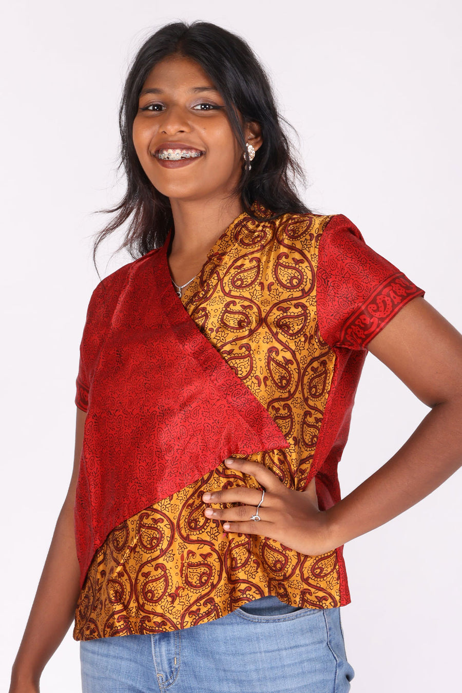 Maroon Handcrafted Bagh Printed Modal Short Top This top is a beautiful, luxe addition to any look. Handcrafted bagh detailing adds a unique touch, and the modal fabric is soft and comfortable.
