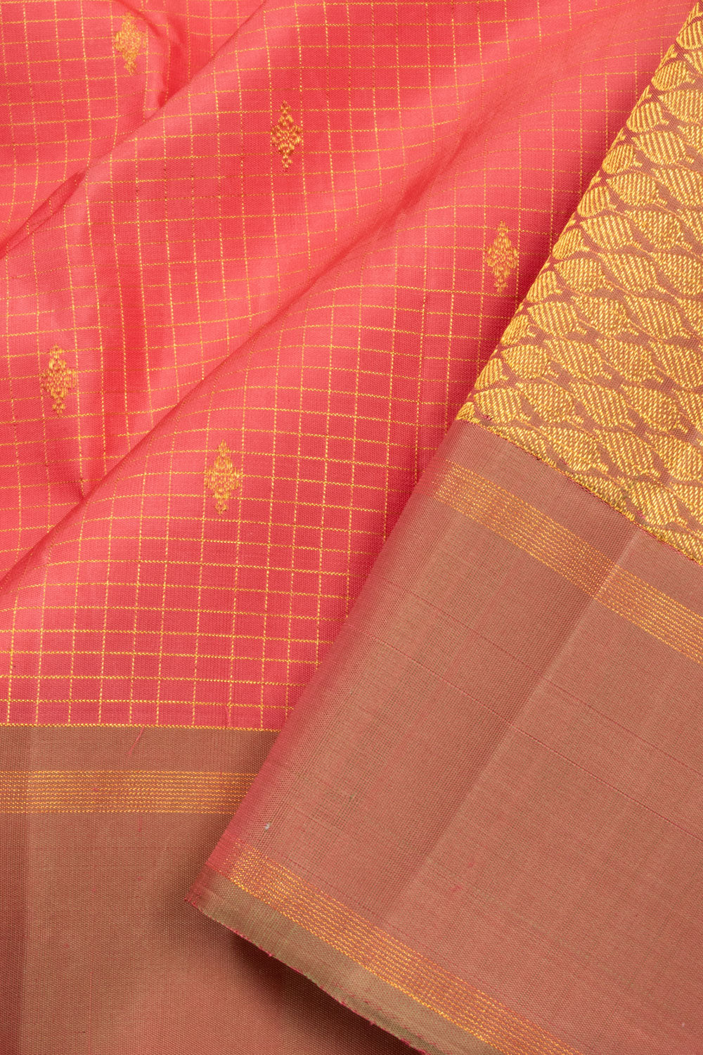 Stand out with the Barn Red Kanjivaram Silk Saree featuring a classic checks design. Crafted from premium silk, this saree combines rich color with timeless patterns, offering a perfect blend of tradition and style. Ideal for f...