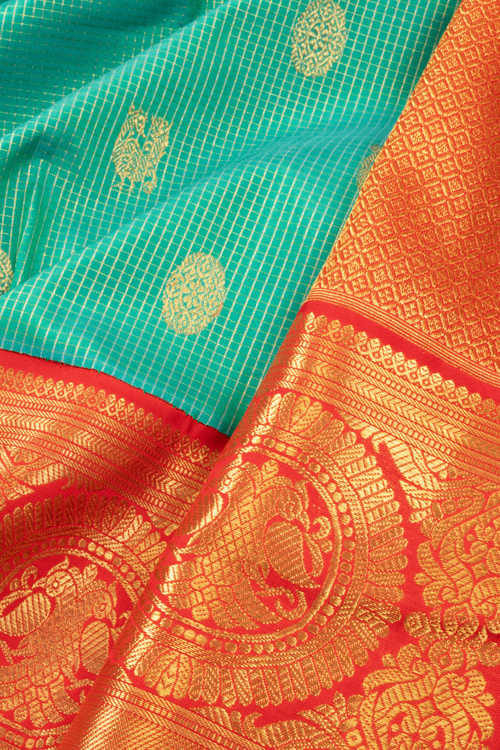 Elevate your elegance with this Teal Blue Kanjivaram Silk Saree, featuring a timeless checks design. Crafted from rich silk, it offers a luxurious feel and vibrant color that enhances your presence at any occasion. The intricat...