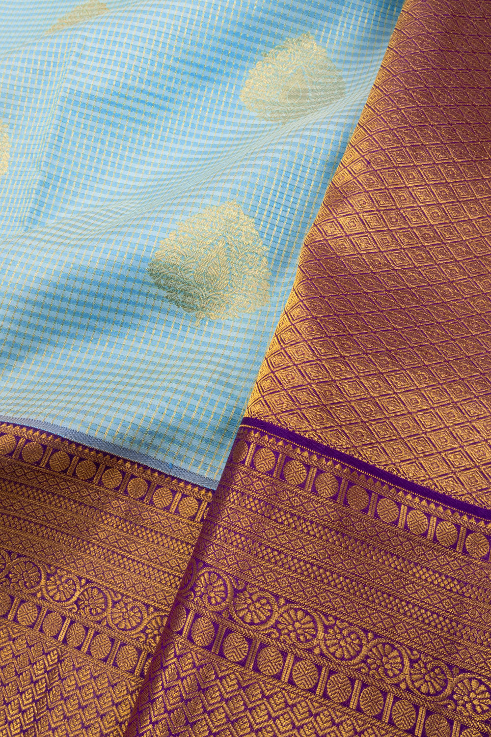 Add a fresh, elegant touch to your collection with the Sky Blue Kanjivaram Silk Saree featuring a timeless checks design. Woven from premium silk, this saree offers a smooth, luxurious feel and vibrant color that enhances any f...