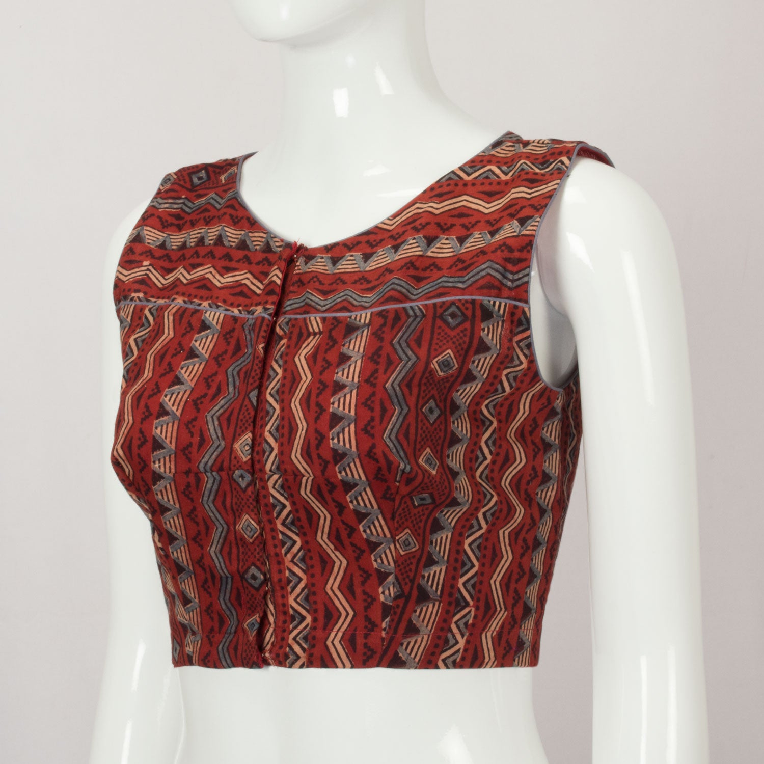 Maroon Ajrakh Printed Sleeveless Cotton Blouse Stay cool and stylish in this Maroon Ajrakh Printed Sleeveless Cotton Blouse. This lightweight design is perfect for all-day comfort.