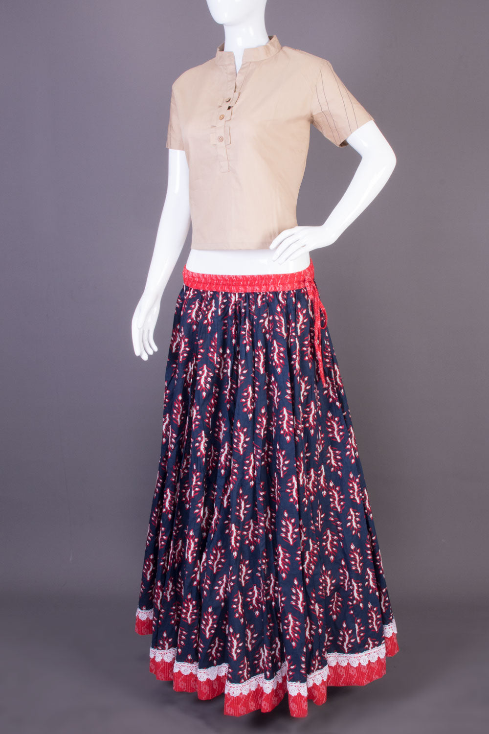Berry Blue Hand Block Printed Cotton Skirt This beautiful denim blue hand block printed cotton skirt is designed to bring style and comfort to your wardrobe. Made with high quality cotton, it's perfect for any occasion and will keep you looking and feeling great all day long.