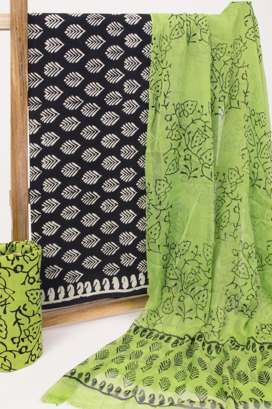 Black Hand Block Cotton 3-Piece Salwar Suit Material With Printed Dupatta 10065070