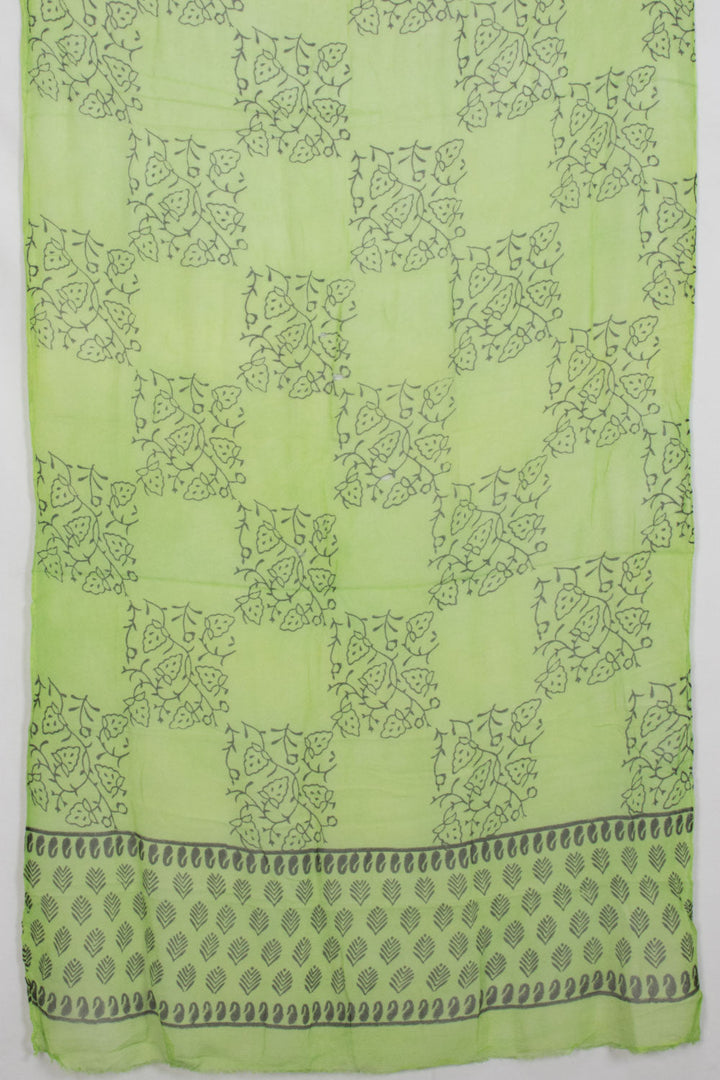 Experience the beauty and comfort of our Black Hand Block Cotton 3-Piece Salwar Suit Material, featuring stunning floral prints on the top. The vibrant green pant is adorned with delicate floral motifs, while the green chiffon dupatta completes the look with its floral pattern. Elevate your wardrobe with this exquisite suit material today!