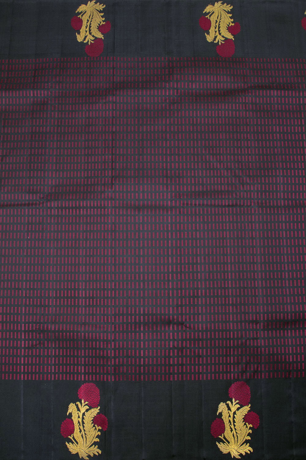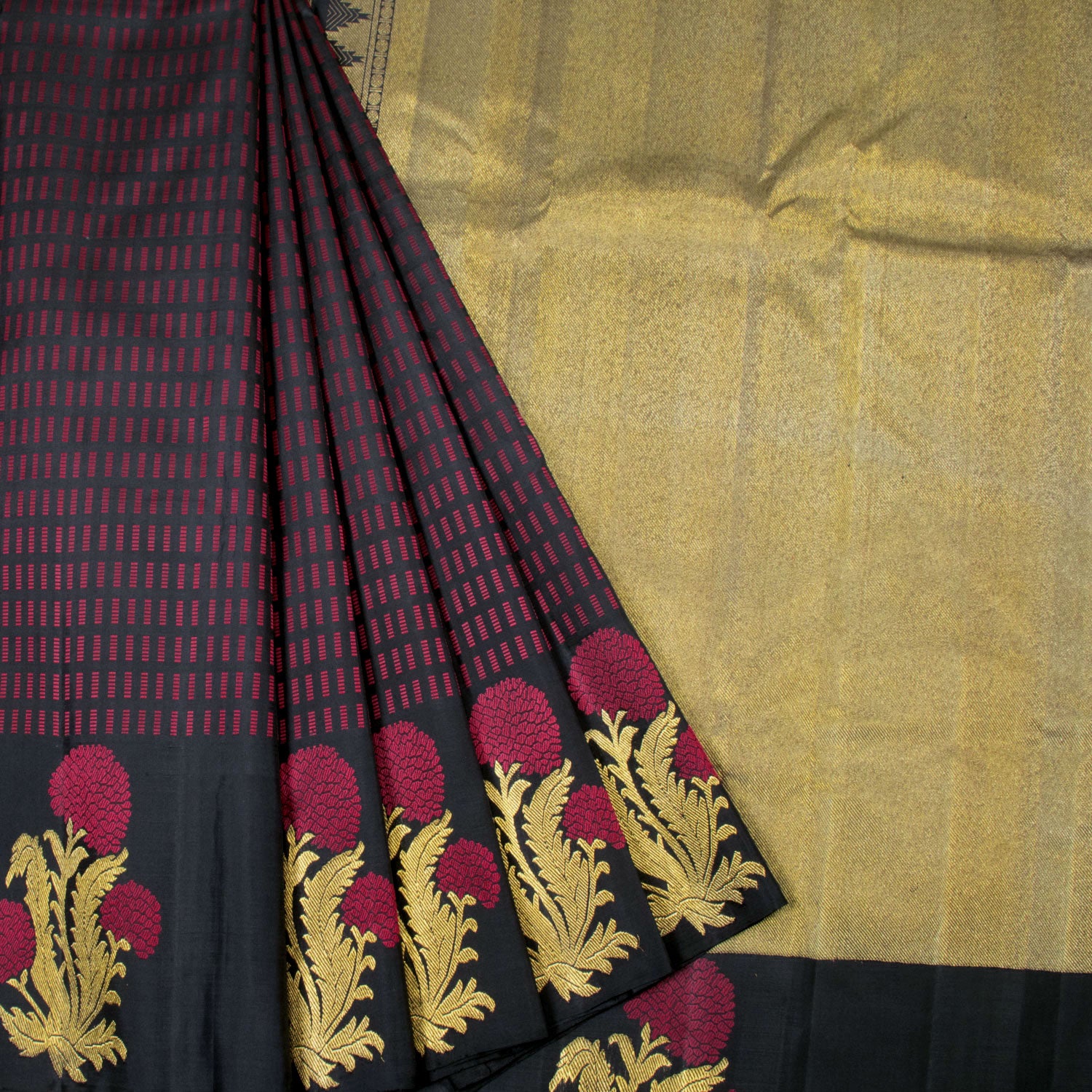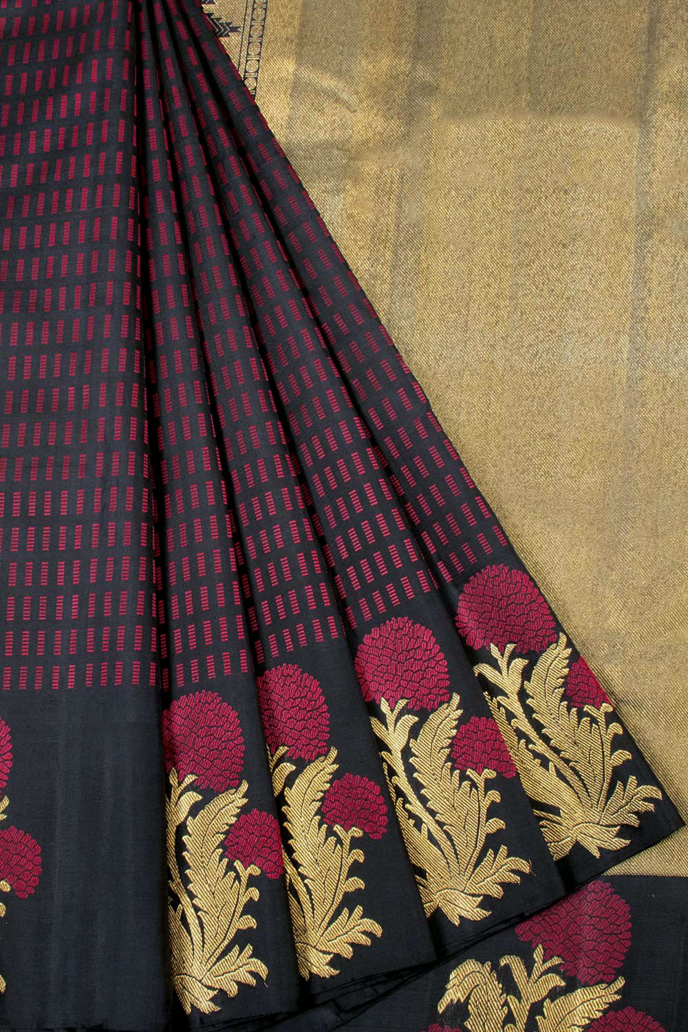 Fashion-forward Kanjivaram Silk Saree in Black, featuring rectangular Motifs in Maroon across the body. The Border is adorned with eye-catching Genda Phool motifs and Gold Zari Leaves. Tissue Pallu completes the look. This saree is perfect for a timeless look. Enjoy the softness and strength of the pure silk, and the intricate motifs and details that make this piece truly one of a kind.