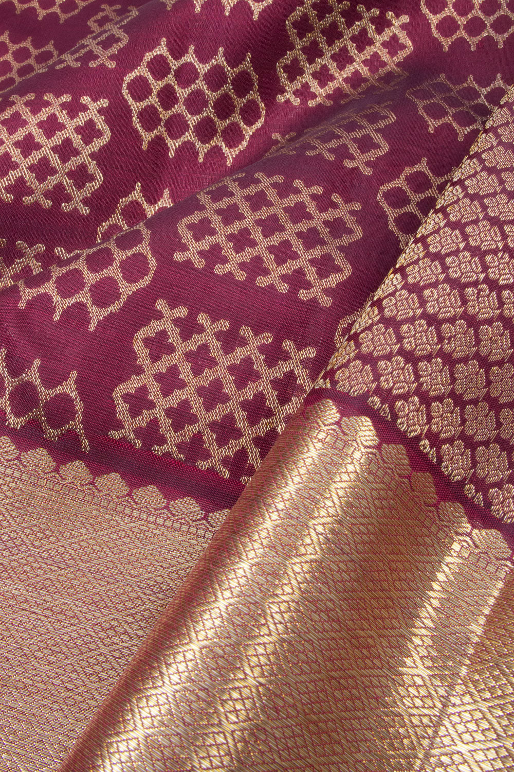 Burgundy Handloom Pure Zari Kanjivaram Silk Saree showcases trellis designs across the body, with a large border featuring zari and floral motifs. Floral and diamond patterns adorn the pallu, while the matching blouse is decorated with a band of floral motifs. Crafted from luxurious Kanjivaram silk, this saree exudes grace and distinction, with intricate designs that make a timeless impression.