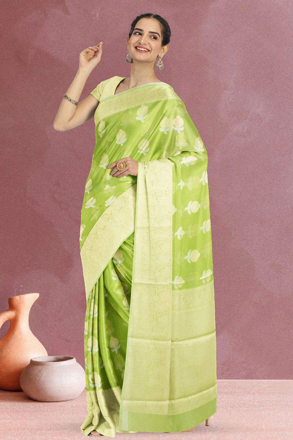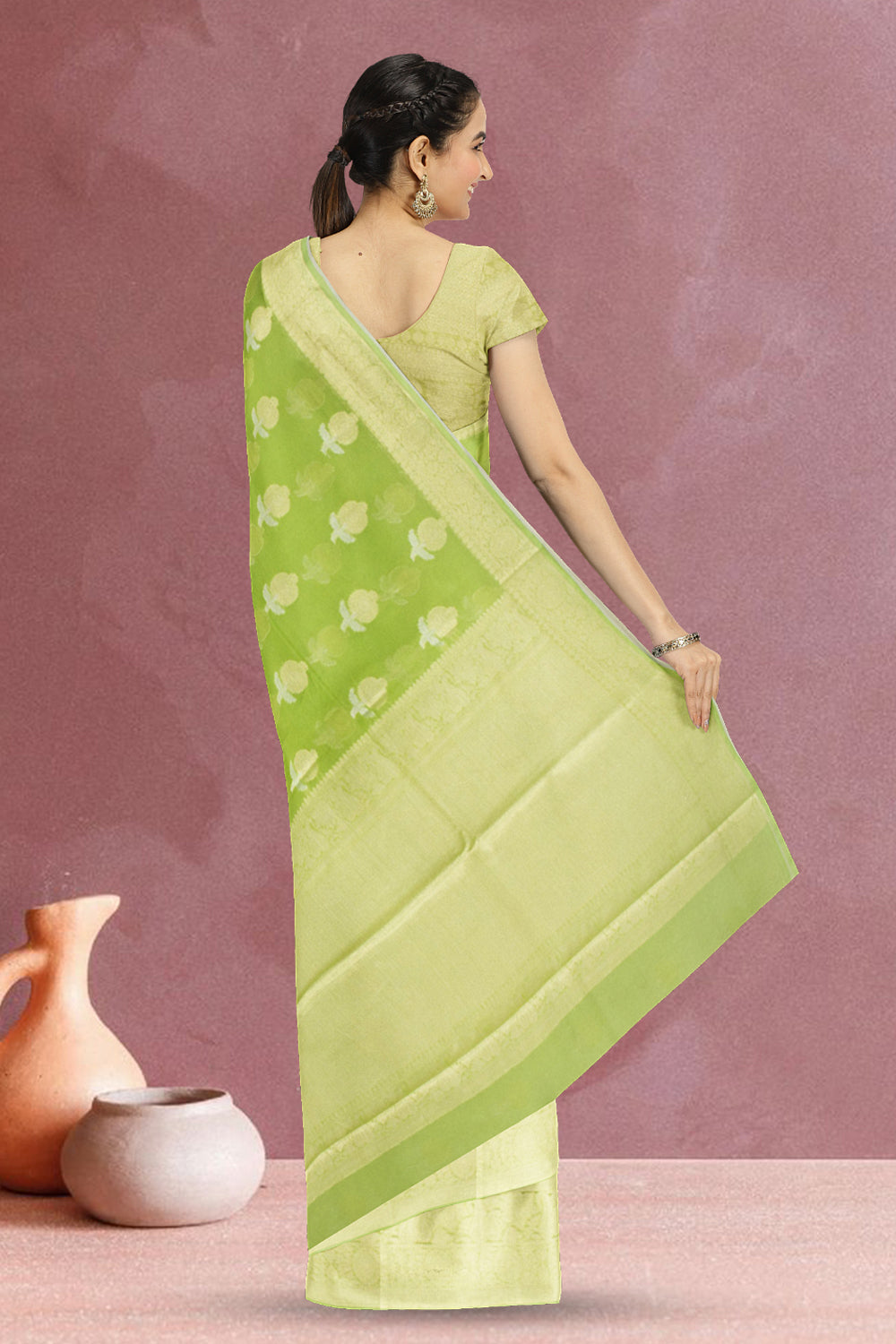 This beautiful saree is crafted in green Banarasi organza fabric and features a subtle, elegant Pallu with intricate weavings. Perfect for formal and casual events.
