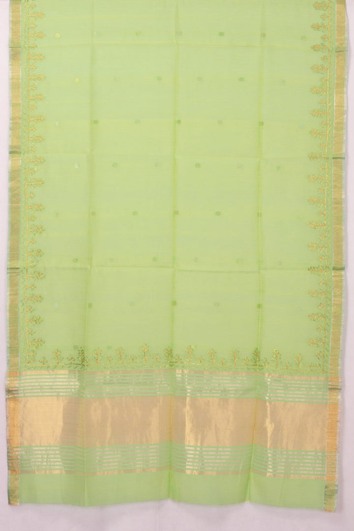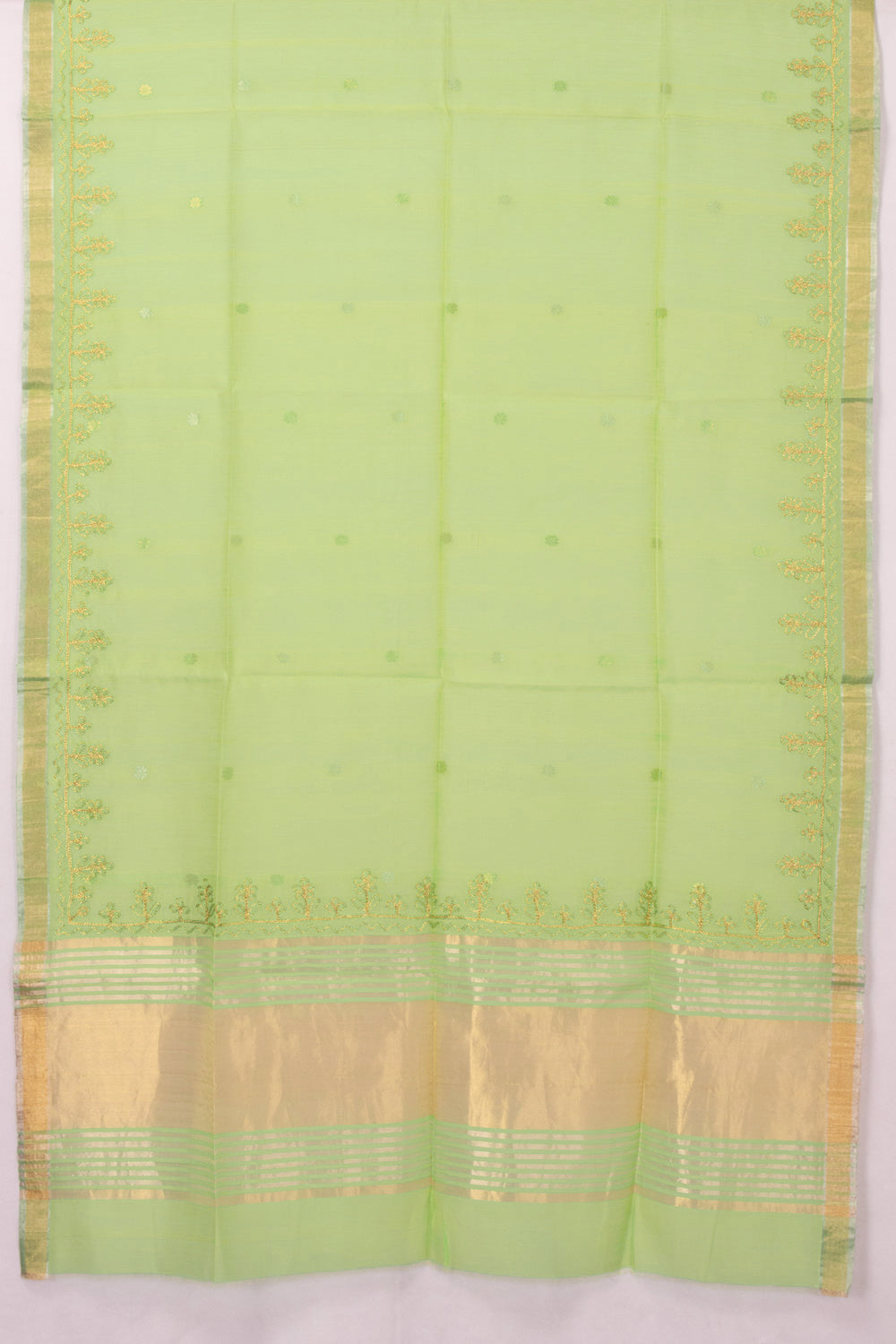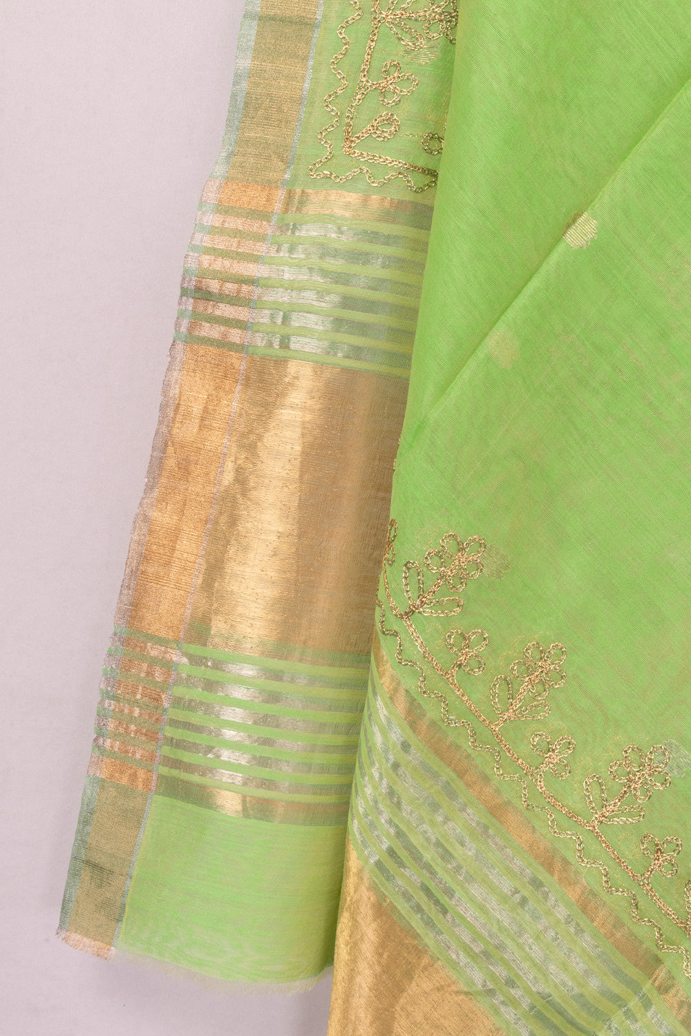 Elevate your outfit with our luxurious Green Embroidery Silk Cotton Dupatta! The mercerised fabric showcases elegant flower booti designs, complemented by a tissue stripe pallu in gold and silver zari. Adorned with intricate Aari embroidery, this dupatta adds a touch of opulence to any look.