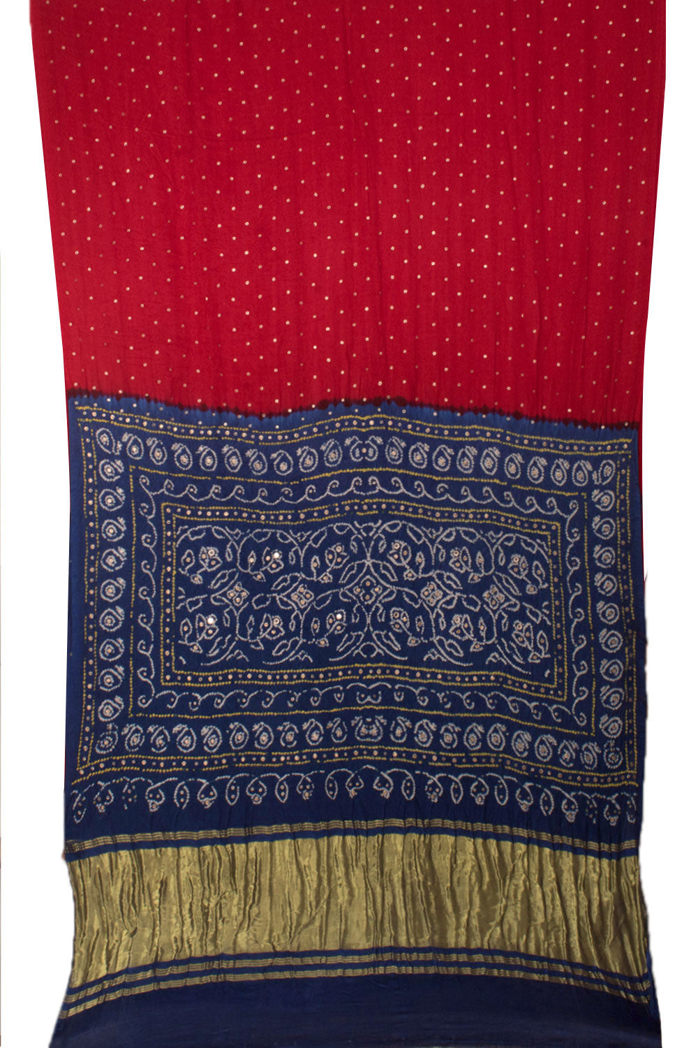 This stunning Tomato Red Handcrafted Bandhani Gajji Silk Saree is adorned with intricate Zari Embroidery all over. The Indigo Blue Pallu boasts delicate floral dana motifs, exquisite sequin Embroidery, and a Lagdi Patti Zari Edging. Complete with a matching Indigo Blue Blouse featuring Dana Patterns, this saree is truly a work of art.