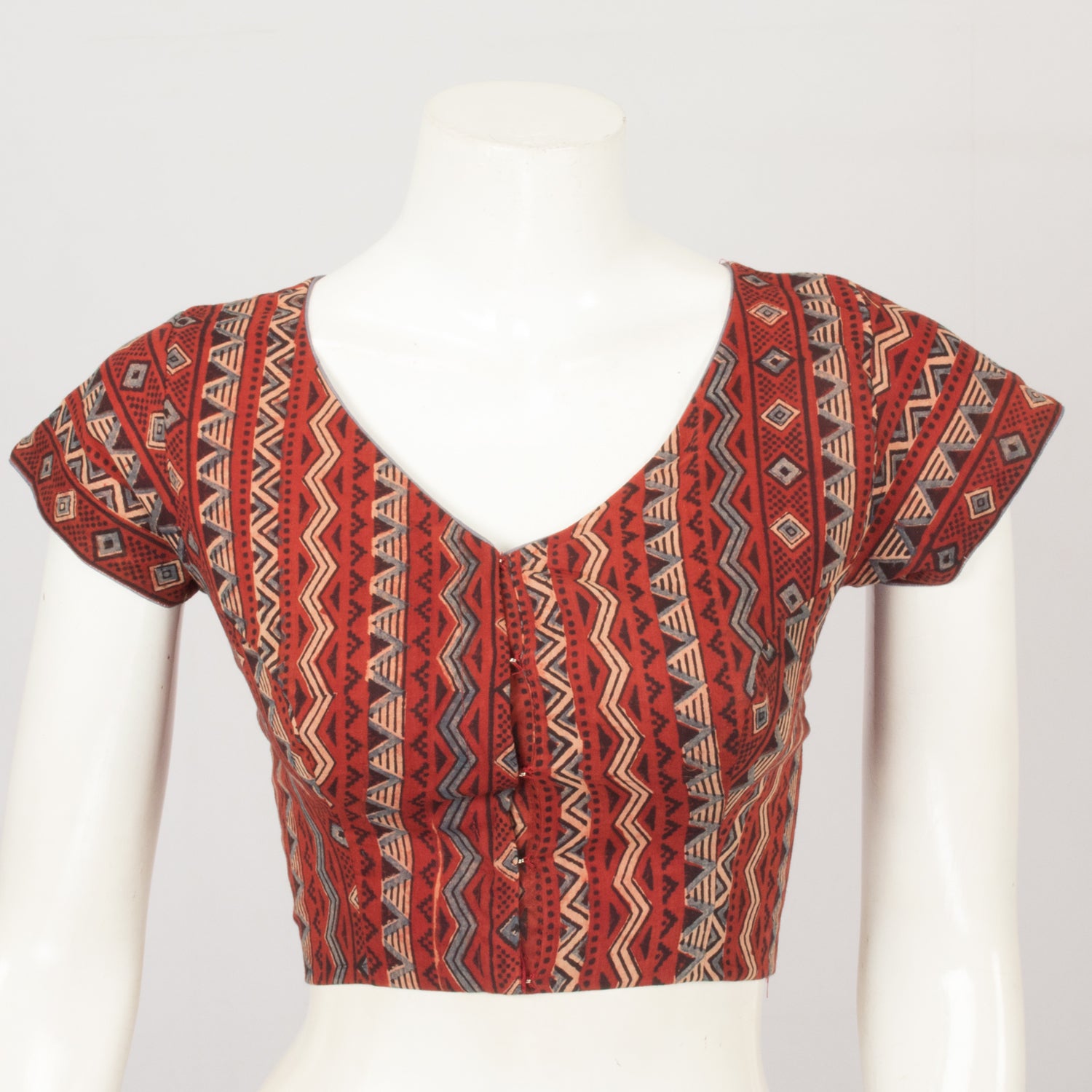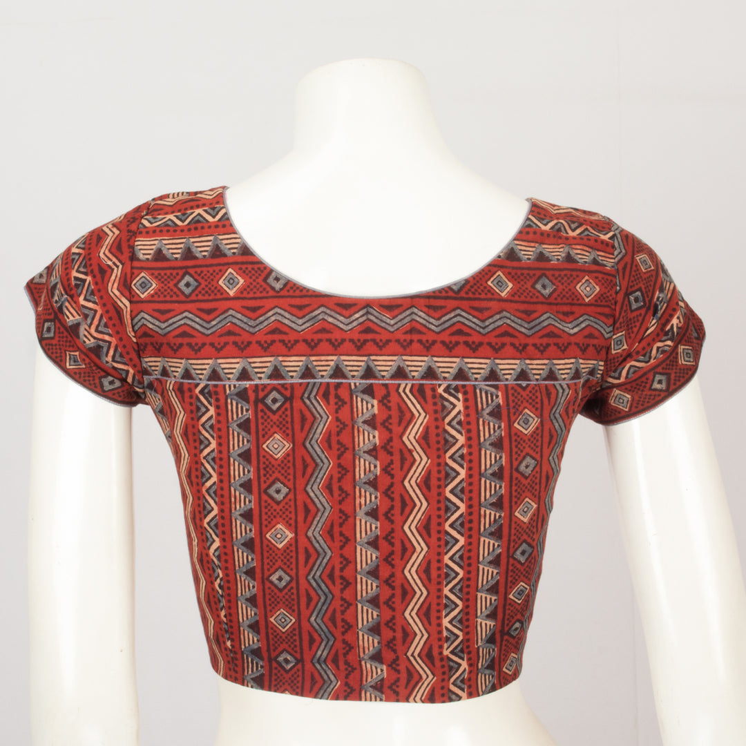 Red Handcrafted Ajrakh Printed Cotton Blouse This one-of-a-kind blouse is crafted with a beautiful Ajrakh print, making it perfect for special occasions or everyday wear.