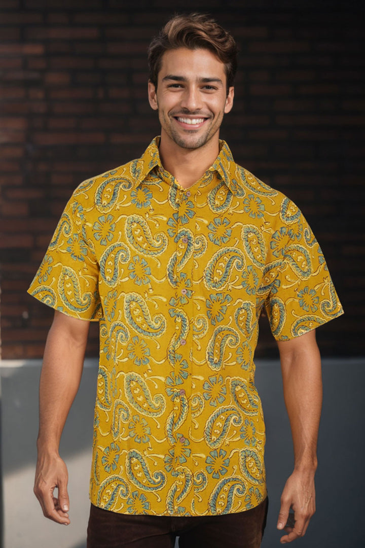 Yellow Half Sleeve Ajrakh Printed Cotton Mens Shirt 10071088
