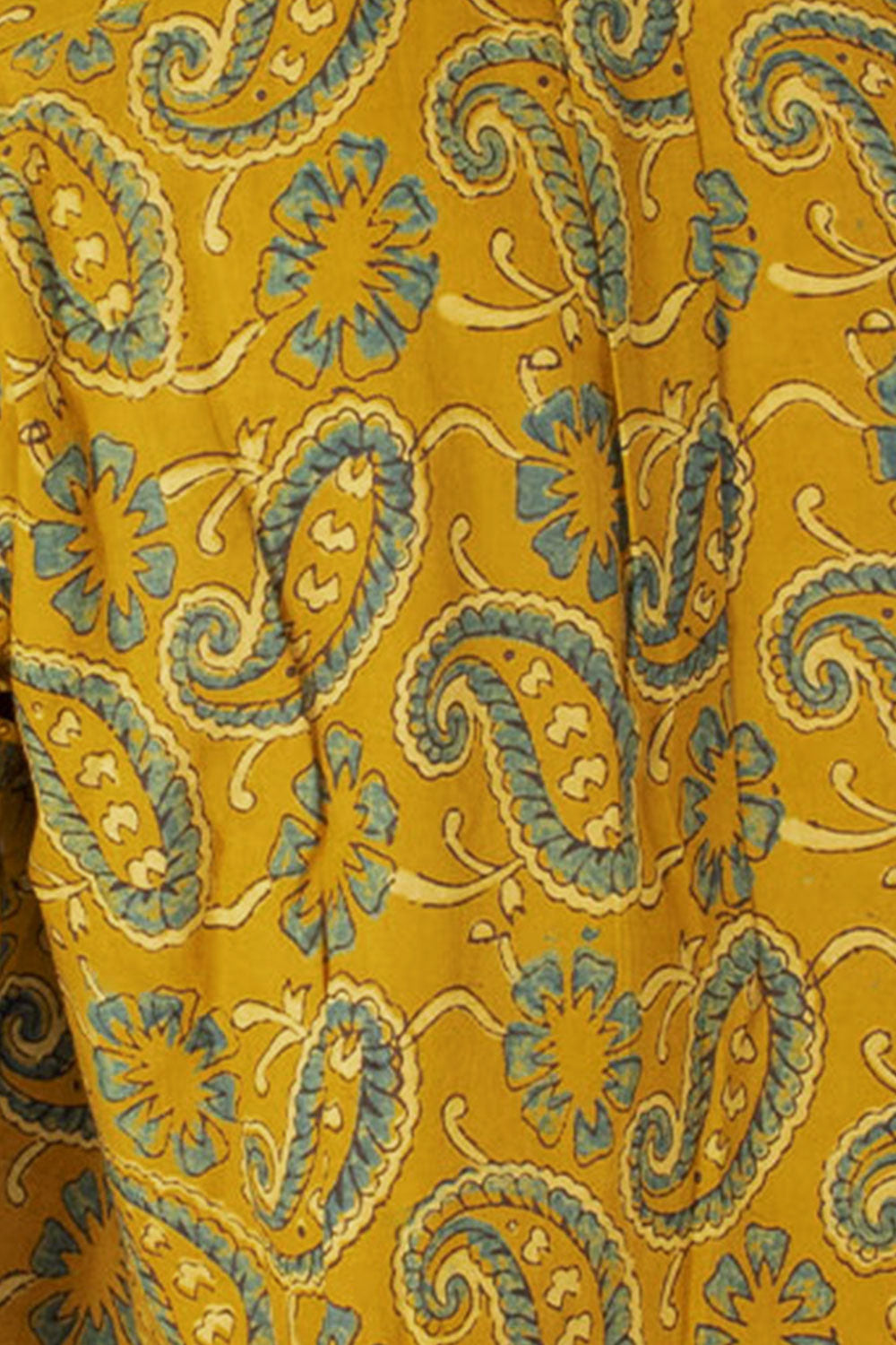 Experience the perfect blend of tradition and style with this Yellow Ajrakh printed cotton shirt. Crafted using natural dyes and featuring authentic wooden buttons, it ensures comfort and sustainability. Easily pair it with jeans, khaki pants, or shorts to create a versatile, eye-catching outfit that highlights your unique fashion sense.