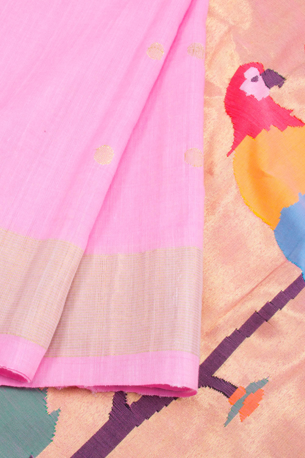A fashionable choice for any summer occasion, our Powder Pink Handloom Paithani Cotton Saree is crafted from 100% cotton and features a beautiful polka dot motif and statement pallu with pretty parrot motifs. Crafted with traditional handloom techniques, this elegant and breathable saree is sure to be a conversation starter.