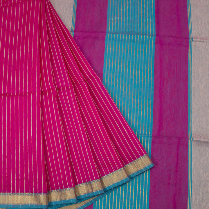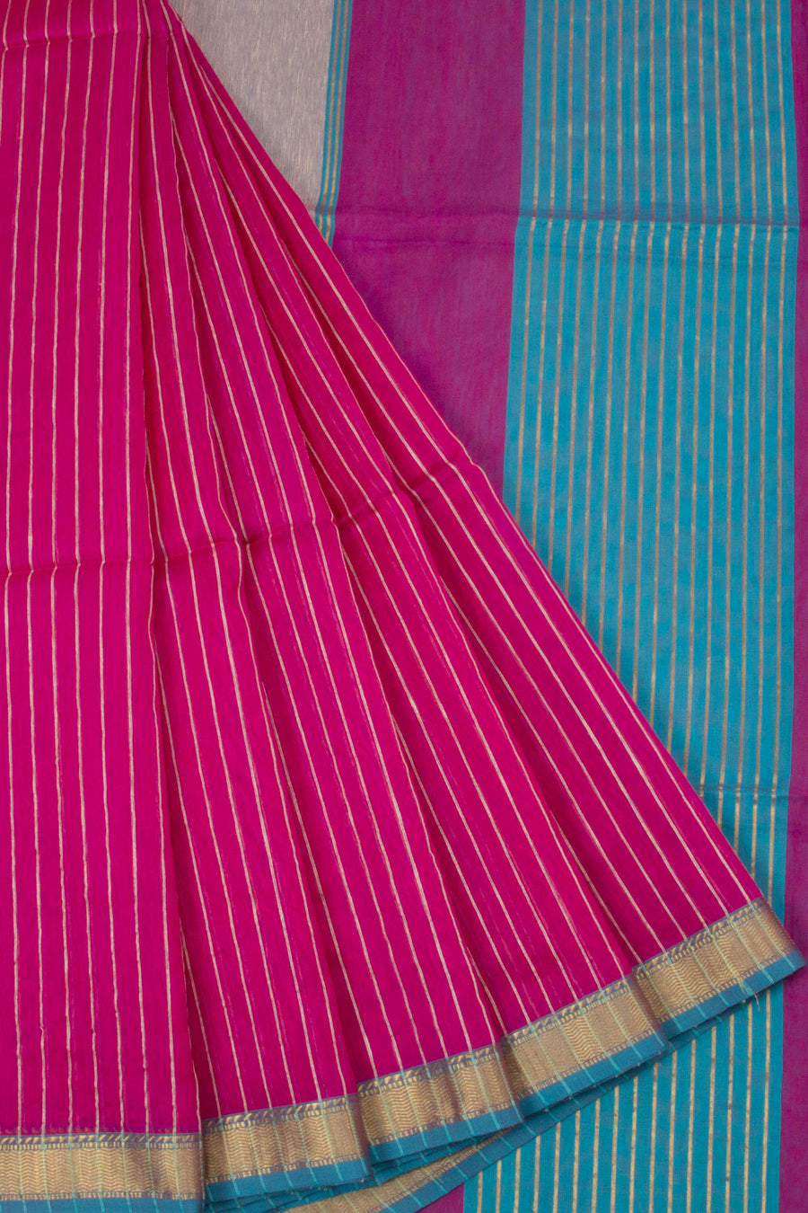 This Dark Fuschia Pink Handwoven Maheshwari Silk Cotton Saree features Geecha Stripes & Lehar Design Zari Border and a pallu with geecha stripes and alternating pink and blue bands. The included Contrast blouse completes the look. Maheshwari sarees are thoughtfully designed with wearability and lightness in mind, making them ideal for special occasions.