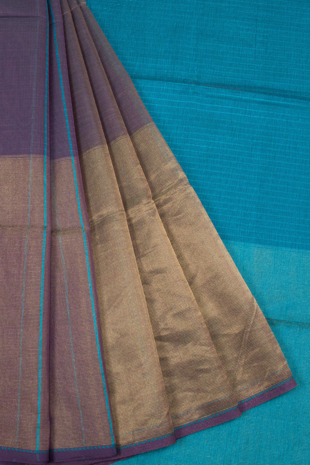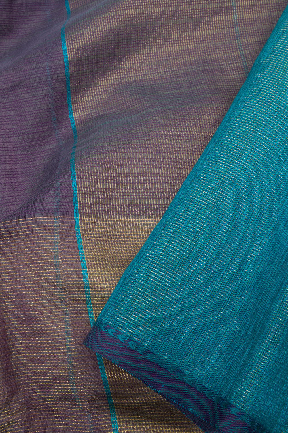 This Old Lavender Purple Handloom Maheswari Silk Cotton Saree is designed with self stripes, a large Tissue Border, and a Colour blocked Blue Pallu. This saree is perfect for any occasion and elegant enough for occasions such as weddings. It is made of durable, high-quality materials to ensure that you can wear it again and again.