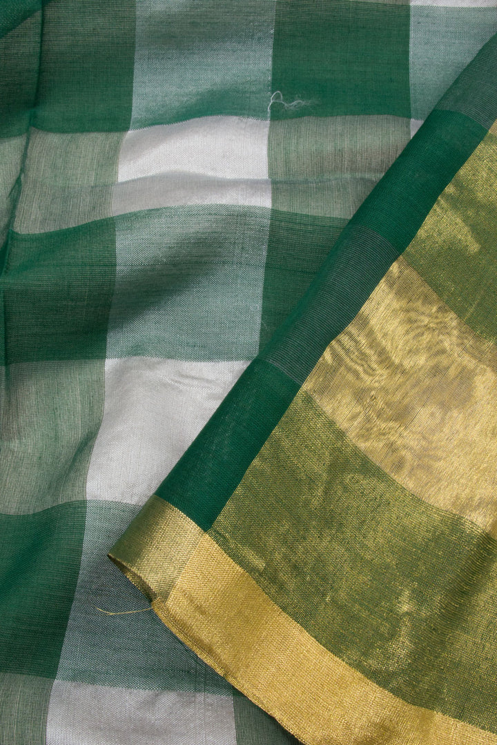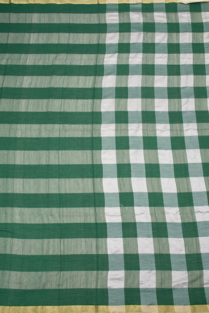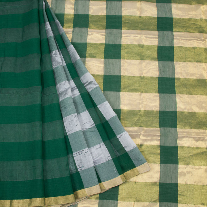 This Maheshwari Silk Cotton Saree features a Checks Design in Green Shades and has a Half & Half structure, with stripes on one portion and checks on the other. Accented with Tissue Zari on the border and Tissue Stripes on the Pallu, it is lightweight and easy to wear.