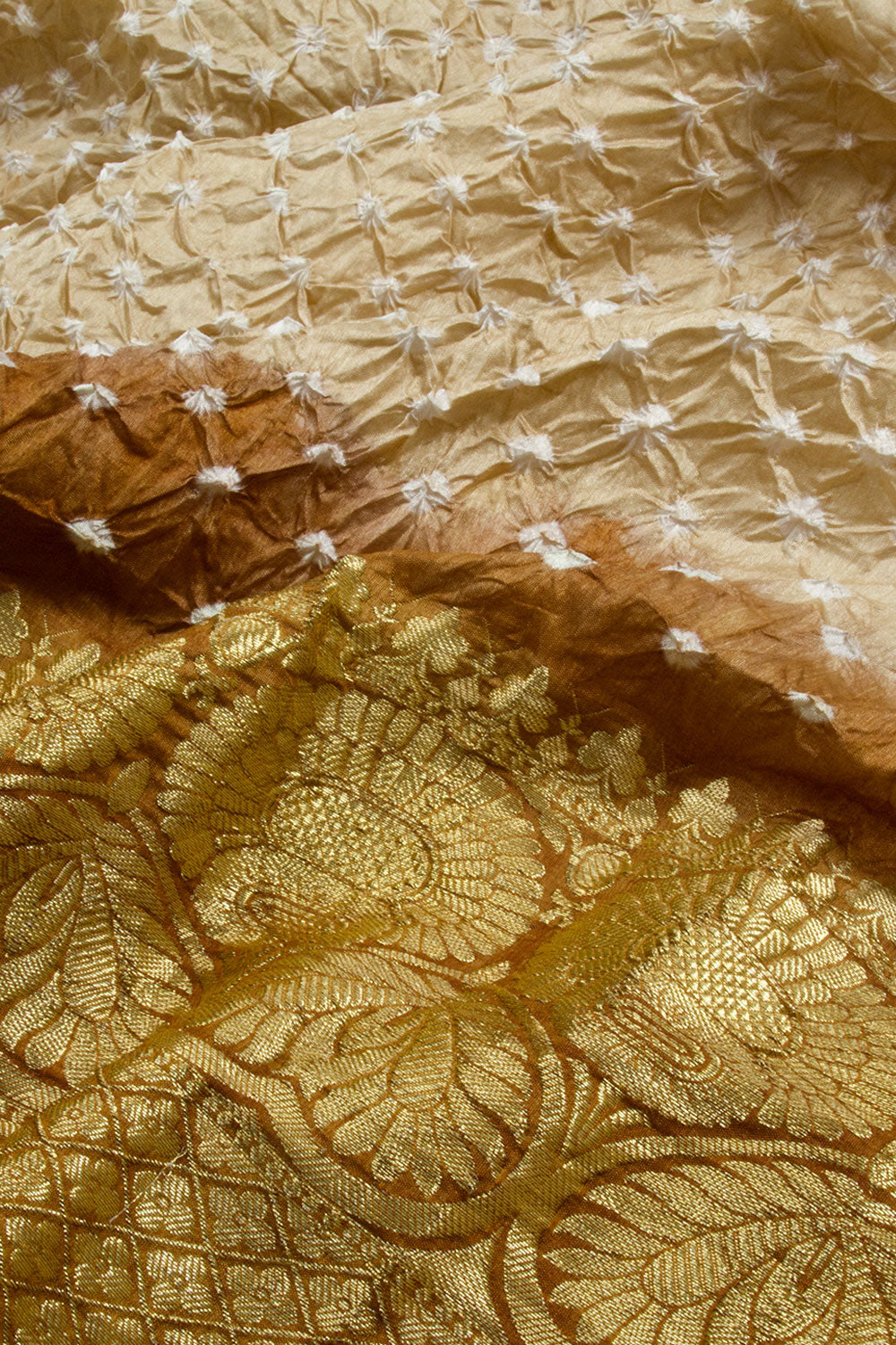 Cream Kanjivaram Pure Silk Bandhani Saree This piece of traditional artistry is crafted with expert care. Crafted from the finest of fabrics, it offers a luxurious drape and vibrant colour that will draw attention.