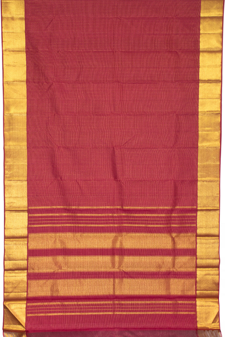 This Maroon Zari Kanjivaram Silk Saree has Zari Checks Design, Bavanji Border, and Zari Bands Pallu. Constructed of pure silk, this saree is meticulously crafted to offer a timelessly sophisticated look, and comes complete with a matching blouse.