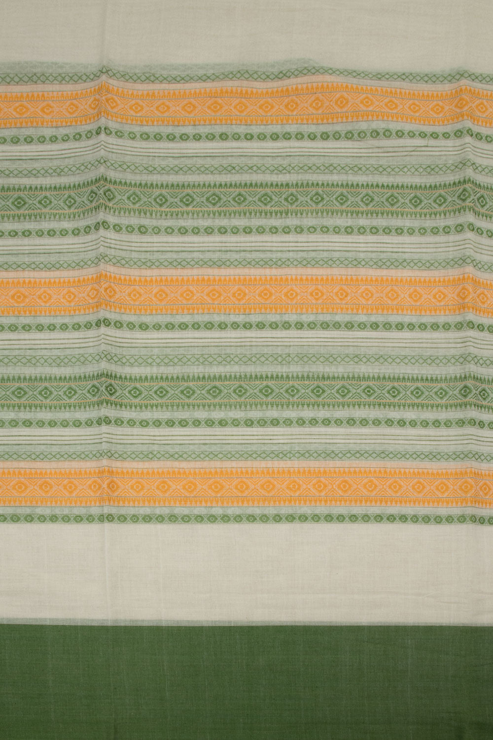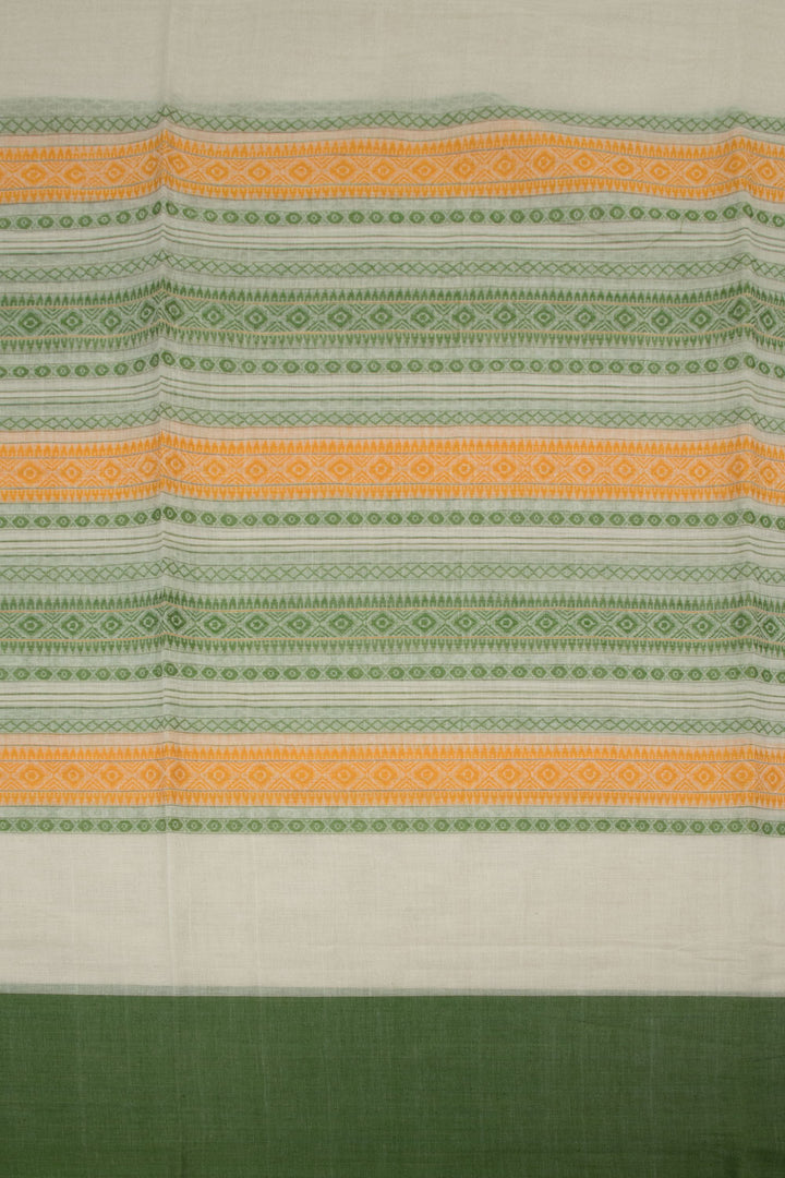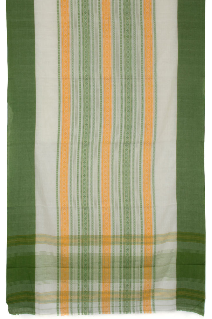 This Off White Handloom Dhaniakhali Cotton Saree boasts striking diamond stripes in Green & Yellow, as well as a contrast Green Border and Striped Pallu. Crafted with soft, breathable cotton, this saree is perfect for the summertime. Its timeless diamond stripes design ensures it will never go out of style.