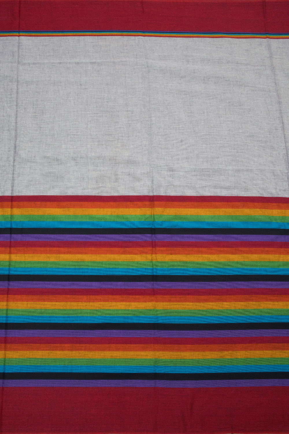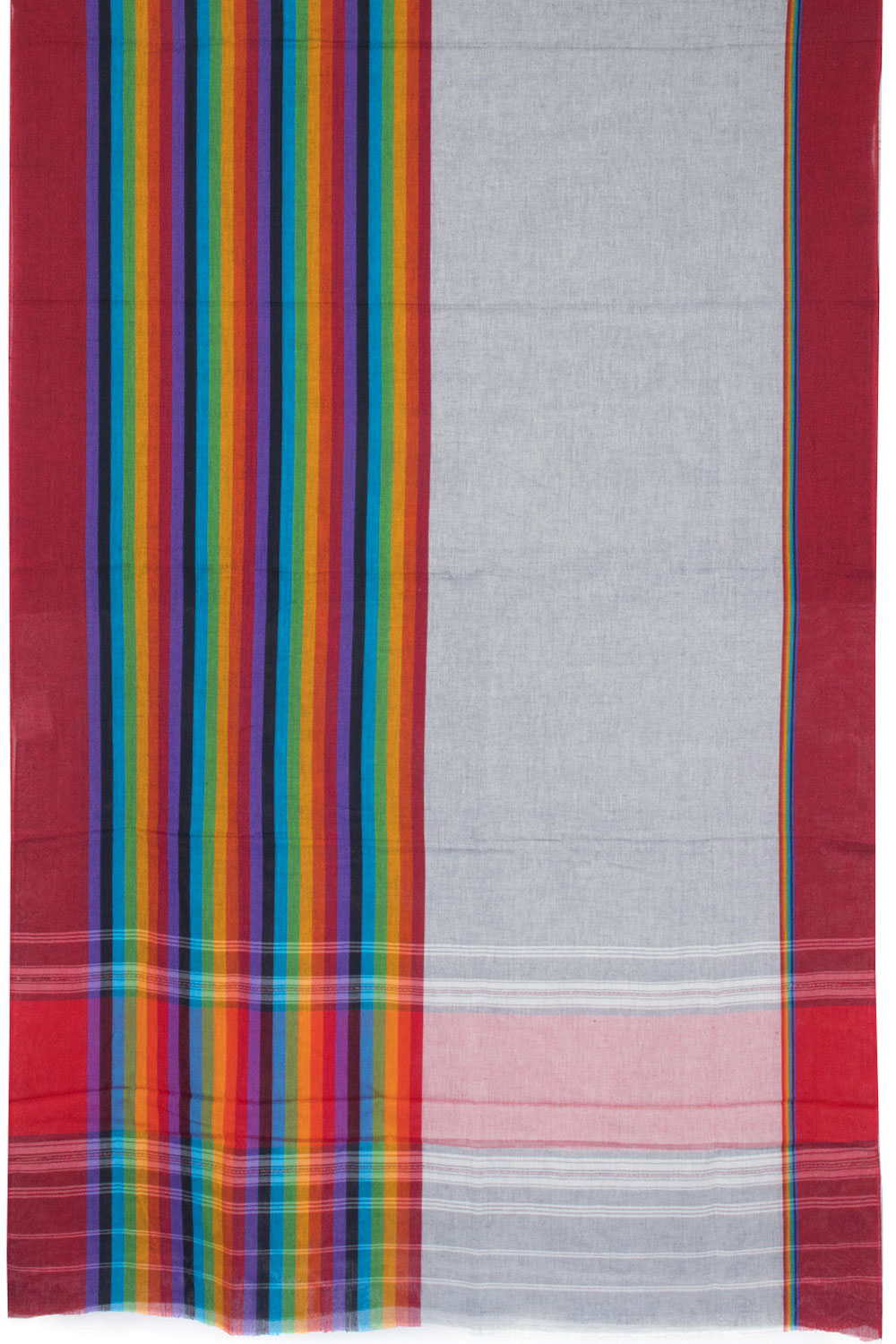 This Nobel Grey Handloom Dhaniakhali Cotton Saree has an intricate striped border and pallu, offering attractive visual contrast. Its premium cotton composition and vivid hues make this garment visually captivating and pleasing to the touch, adding a splash of color to any look.