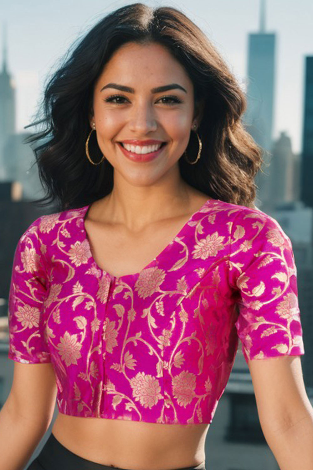 Chinya silk blouses are known for their soft feel, natural sheen, and flowy texture. When woven with Banarasi motifs, they become versatile statement pieces that complement both minimal and ornate sarees. They’re breathable enough for long wear yet dressy enough to elevate your look without much effort.