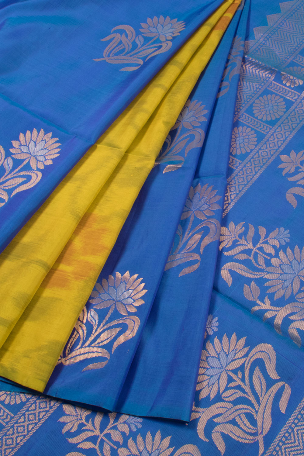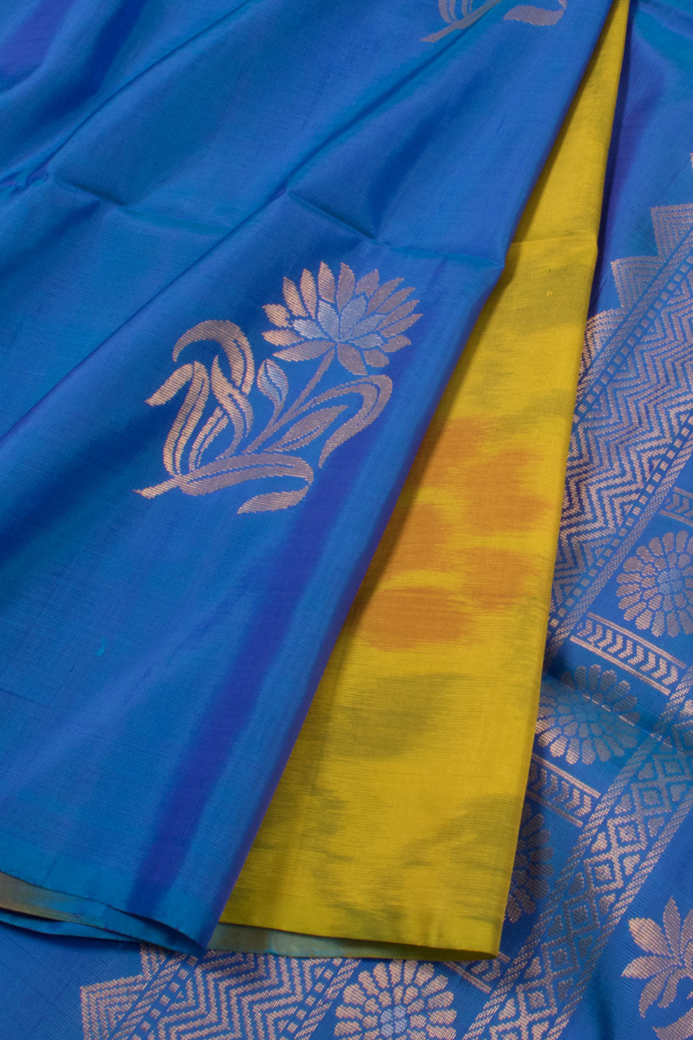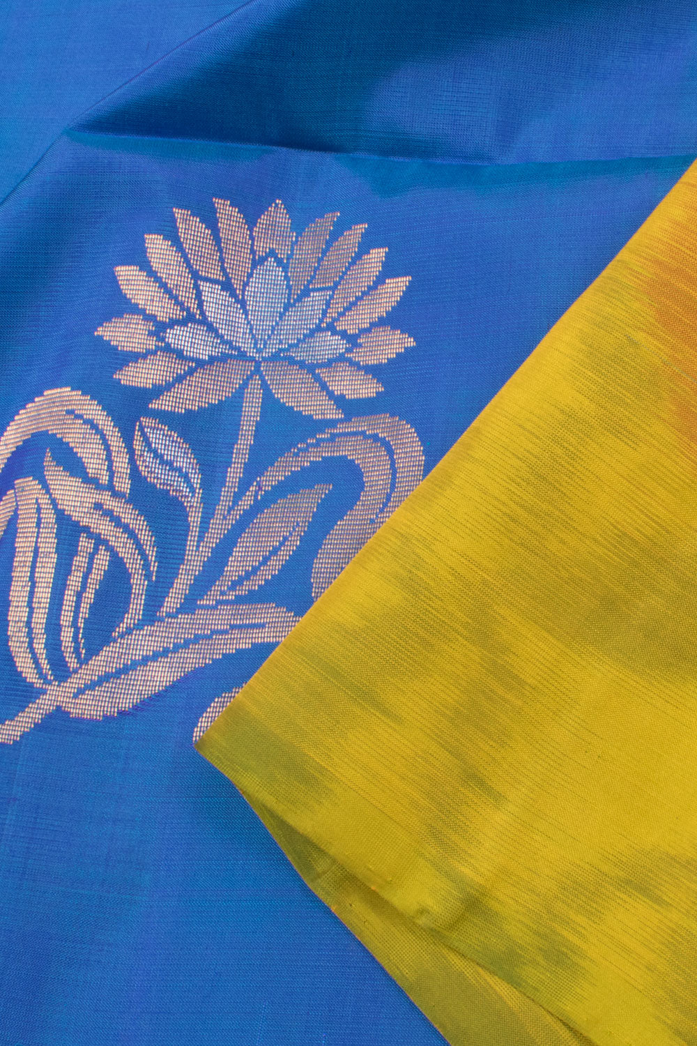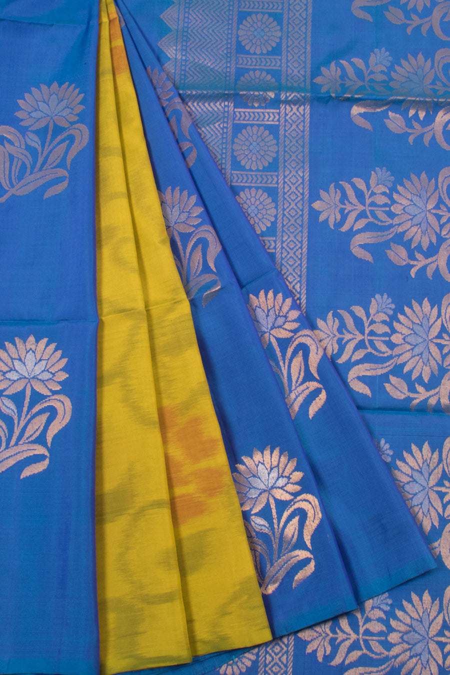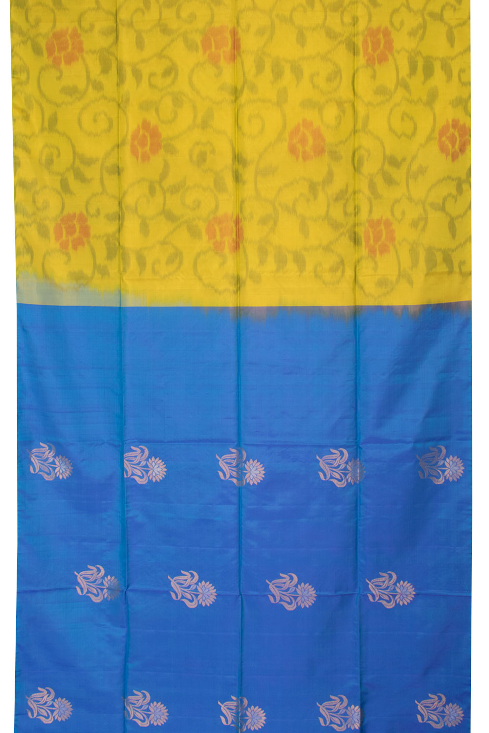 Experience the captivating beauty of our Admiral Blue Handloom Kanjivaram Soft Silk Saree! Featuring a stylish Partly Pallu Design and striking Bold Floral Motifs in Gold & Silver Zari, this saree is an ode to traditional craftsmanship. The yellow pleats section, meticulously crafted using the exquisite ikat technique, adds the perfect pop of color. Complete the look with the included Ikat Blouse and exude confidence and elegance with every wear.